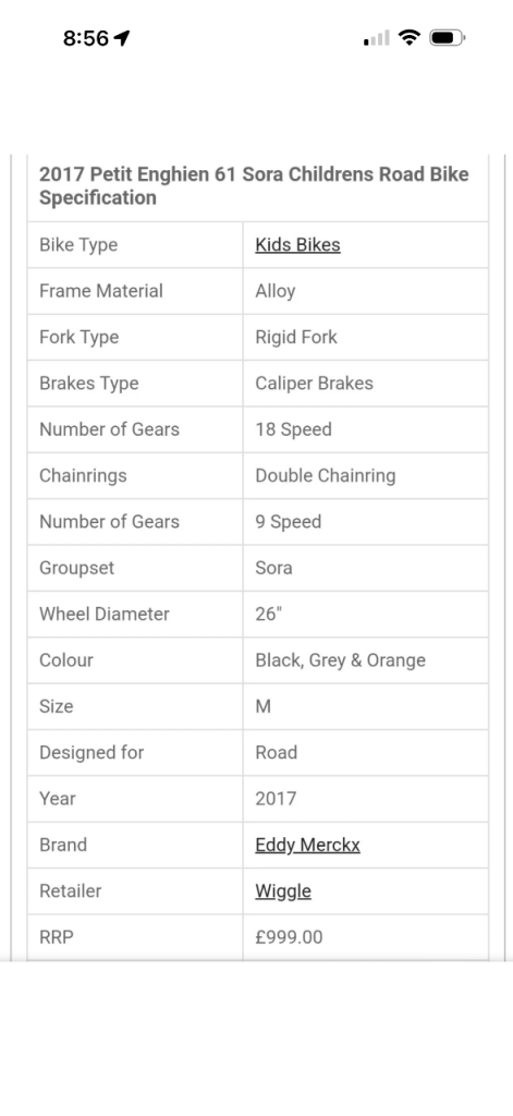 Great Spec: Shimano Full Sora group set, qr wheels, Schwalbe CX Pro K guard tyres, drinks holder, comfy saddle. Comes with a choice of peddles ie I can fit Cleats or SPD’s used or new standard paddle when sold.