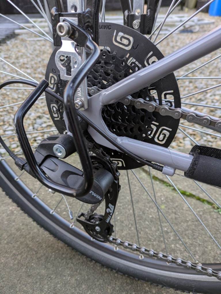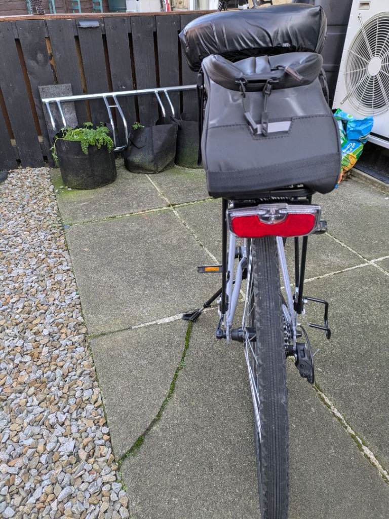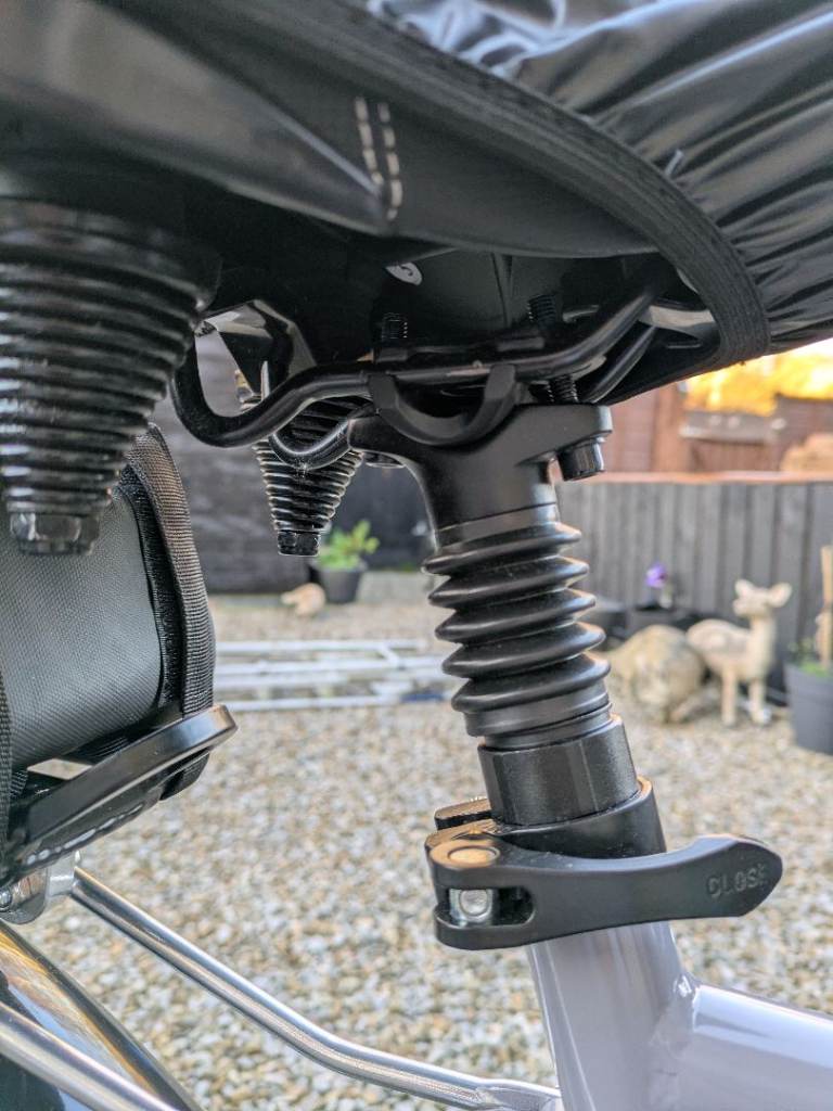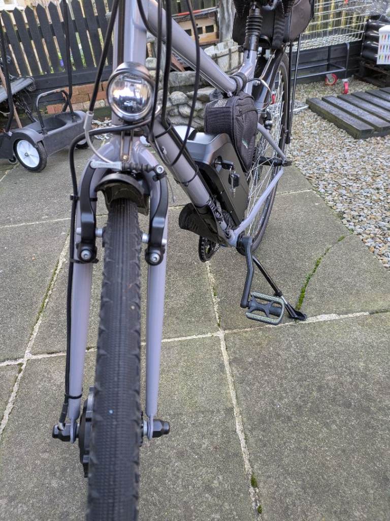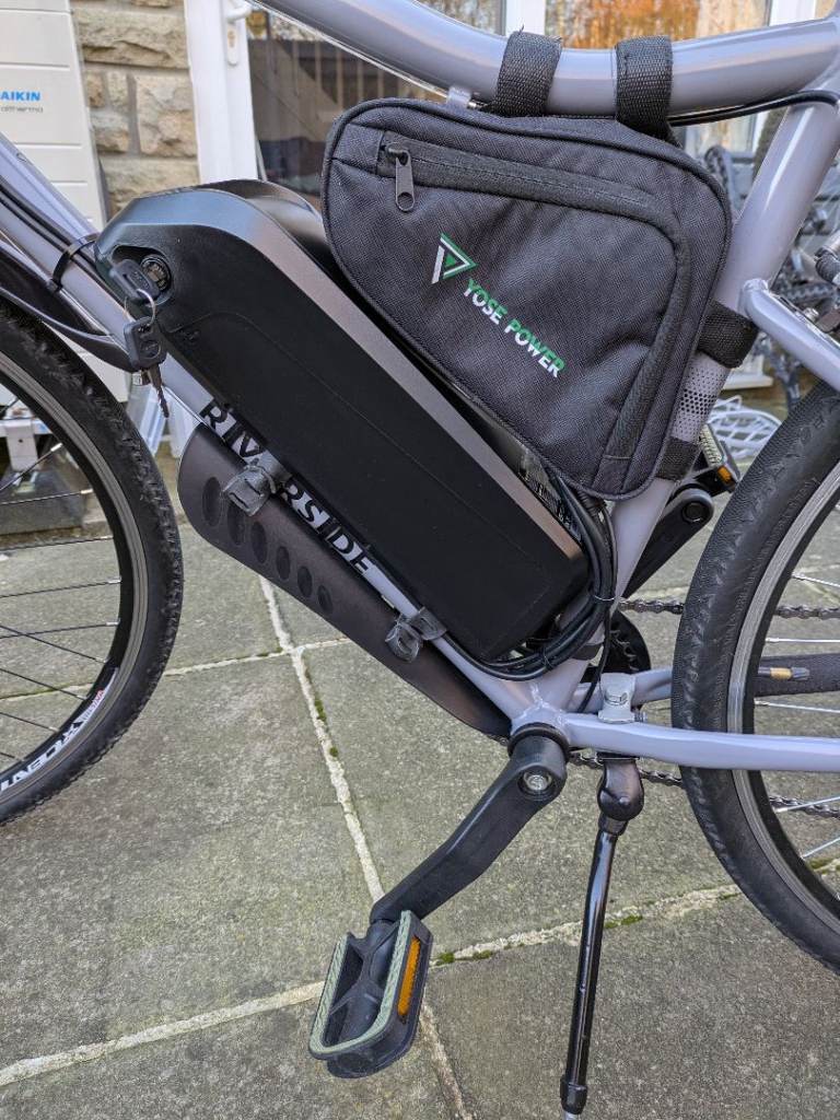 250 watts. Throttle. 35 mile before it needs a charge. Suspension seat. Bike is nearly new. Luggage bag and rack.