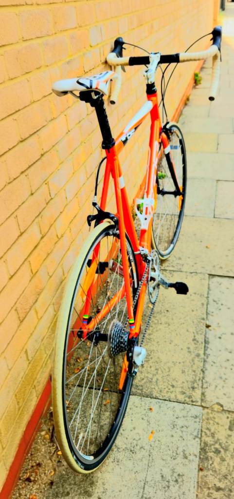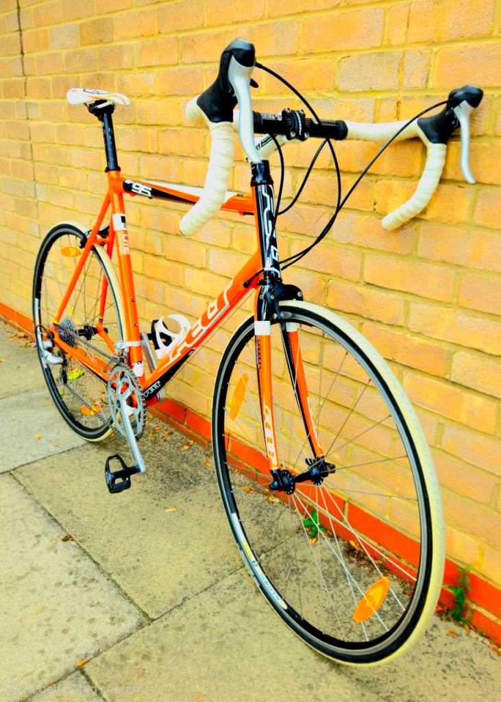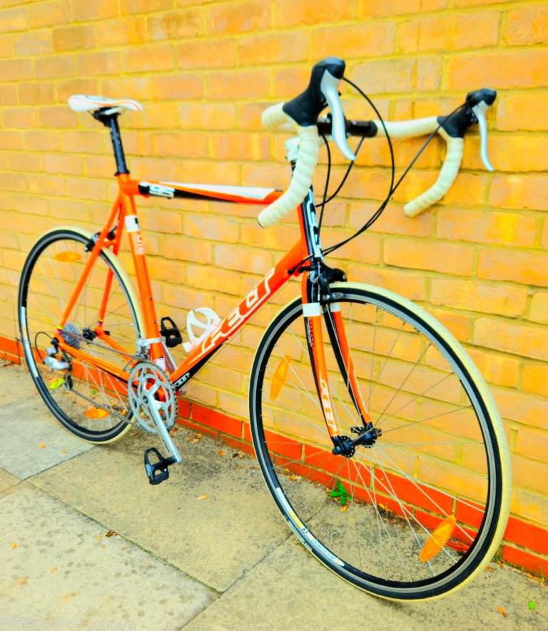 This is amazing lightweight aluminium and carbon fibre road bike its a very bright light nice orange and white colour, shimano sora groupset, its 2×9 27-speed