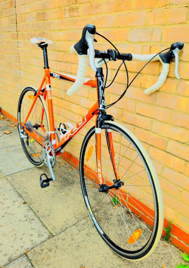This is amazing lightweight aluminium and carbon fibre road bike its a very bright light nice orange and white colour, shimano sora groupset, its 2×9 27-speed
