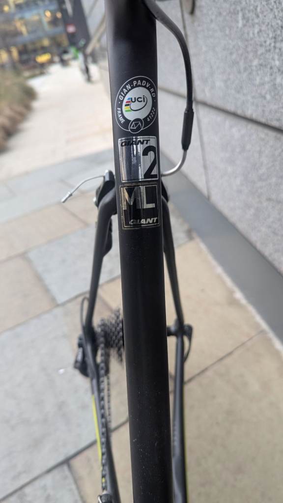 As a Size ML, it perfectly fits riders between 5'10" and 6'1" (178cm – 185cm). The bike is equipped with a full Shimano 105 (5800) 11-speed groupset and the original Giant P-A2 aero wheelset.