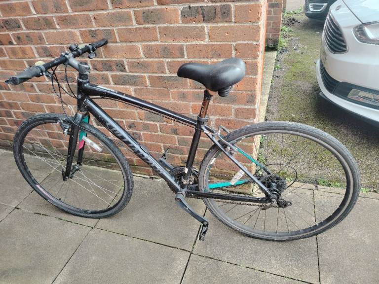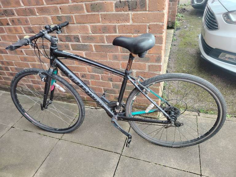 The Specialized Hybrid Bike in black is designed for men with a medium aluminium frame size. It features a flat handlebar, 700C tubular tyres, an adjustable seat. It is ideal for cyclists looking for a high-quality and reliable bike . Size M and price £109 ONO