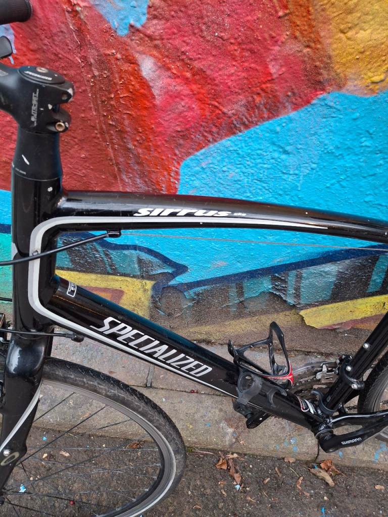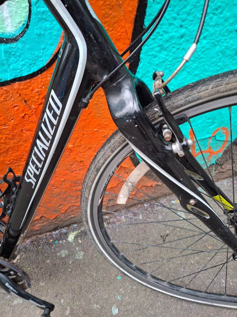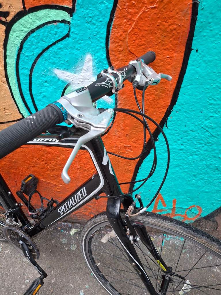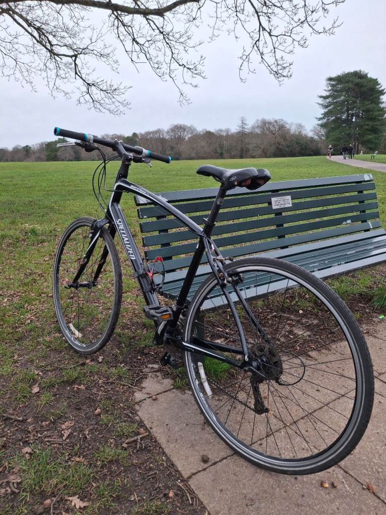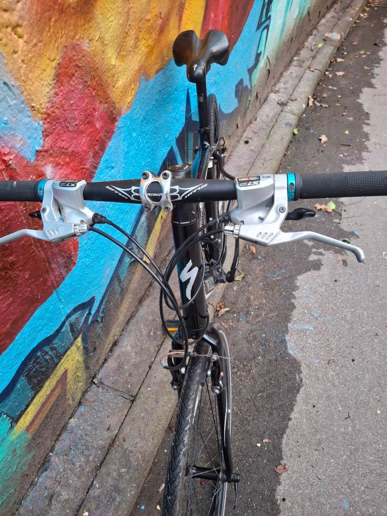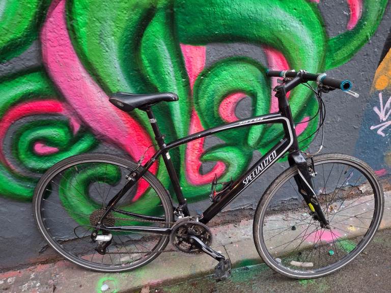 Specialized Sirrus Elite large hybrid bike, fully working, great ride, 27 speed Shimano Deore/Altus gears with Deore ZX shifters. Black aluminium frame is large (around 21 inch), front forks have Zertz shock absorbing inserts, original branded Specialized stem & bar. Wheels are Alexrims S500 with 700 x 28c Schwalbe Marathon tyres, all good and straight. Quick release skewers front and rear. Clarkes brake pads.