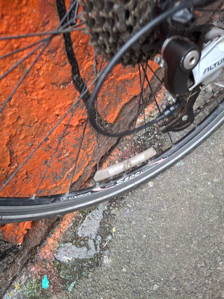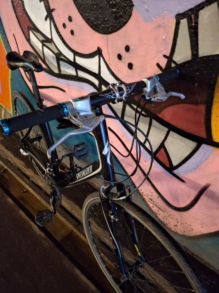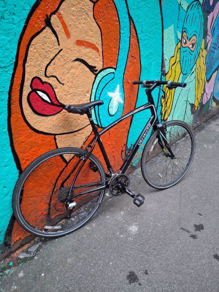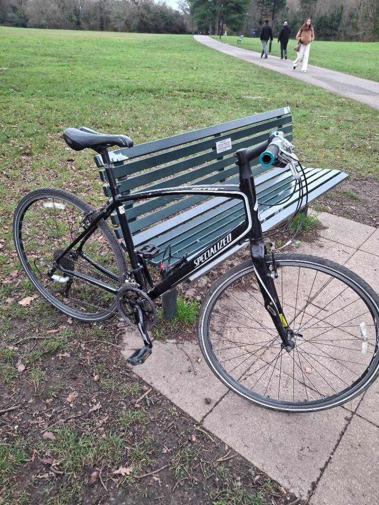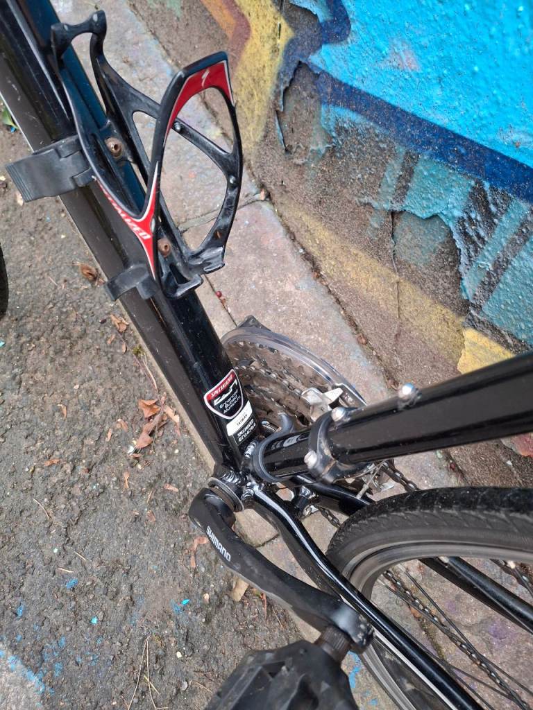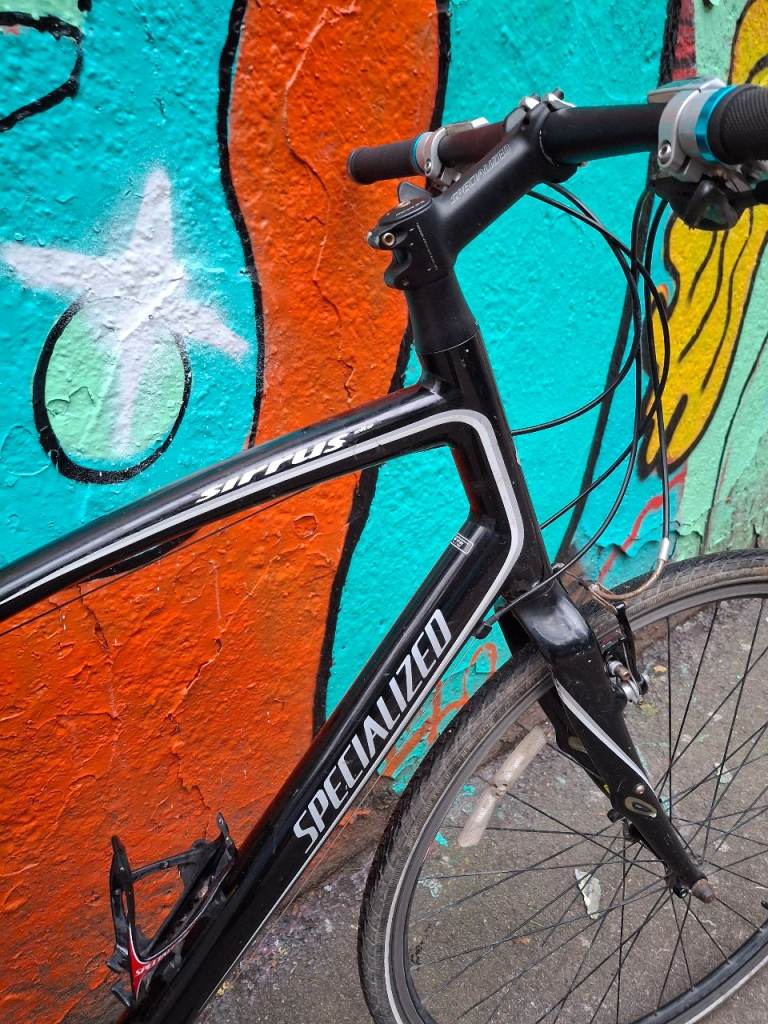 Specialized Sirrus Elite large hybrid bike, fully working, great ride, 27 speed Shimano Deore/Altus gears with Deore ZX shifters. Black aluminium frame is large (around 21 inch), front forks have Zertz shock absorbing inserts, original branded Specialized stem & bar. Wheels are Alexrims S500 with 700 x 28c Schwalbe Marathon tyres, all good and straight. Quick release skewers front and rear. Clarkes brake pads.