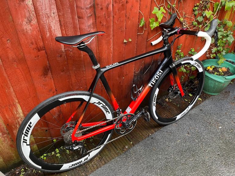 Very nice Tifosi carbon road bike in fantastic condition and fully serviced with lots of new parts. Full carbon frame and forks with bolt thru 100/142 12mm axles and flat mount disc fitment, also attachment points for mudguards. 56cm seat tube c-t, 54cm top tube c-c. Uncut fork steerer so plenty of handlebar height adjustment, I can cut the steerer if you require. Shimano 105 R7020 hydraulic STI 22speed gears and brakes with long cage rear mech, Rotor 3D chainset with 50/34 rings, combined with the 11-32 cassette. 3T Arx Team stem with Prime Doyenne aero handlebars. Deep section 50/40 carbon disc wheels with centrelock rotors, Vittoria Rubino Graphene 2.0 28mm tyres set up with tubes but I believe the wheels can be setup tubeless. Carbon seatpost with Fabric saddle, Shimano 105 composite SPD-SL pedals, Prime out front alloy Garmin mount, Specialized bottle cage.