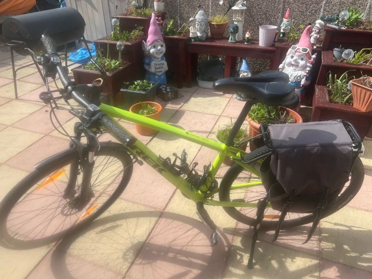 Trek dual sport bike frame size M bontrager tubeless ready wheels rear rack and panniers side stand garmin computer holder. Go pro mount gears need adjustment disc brakes squeal when used probably an easy fix if you know your doing .double sided pedals side clip on 2 bottle cages