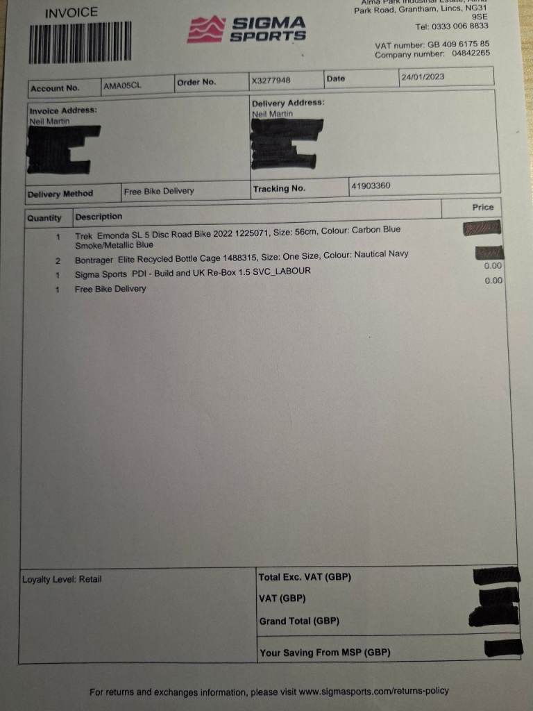 Bought new from Sigma Sports in January 2023. Photo of purchase invoice attached.