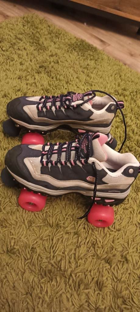 Rollerboots with front stopper laced and velcro front whit, blue and pink colour. Great condition only used once. From smoke free home. Also have size 6 eur 39 Skechers rollerboot available with front and one back brake .