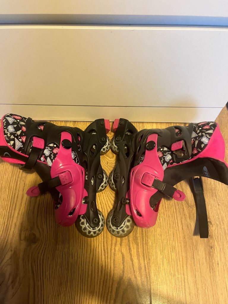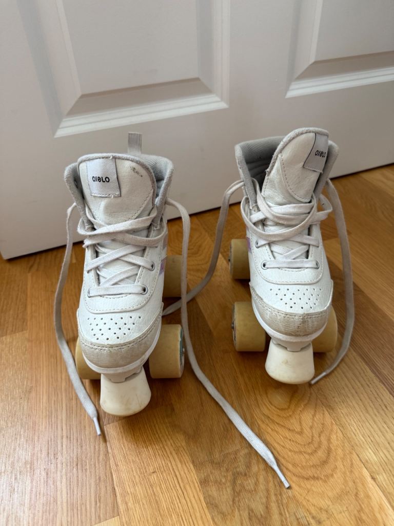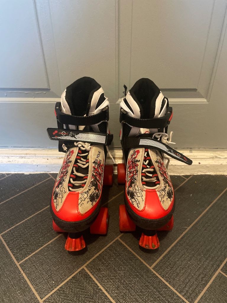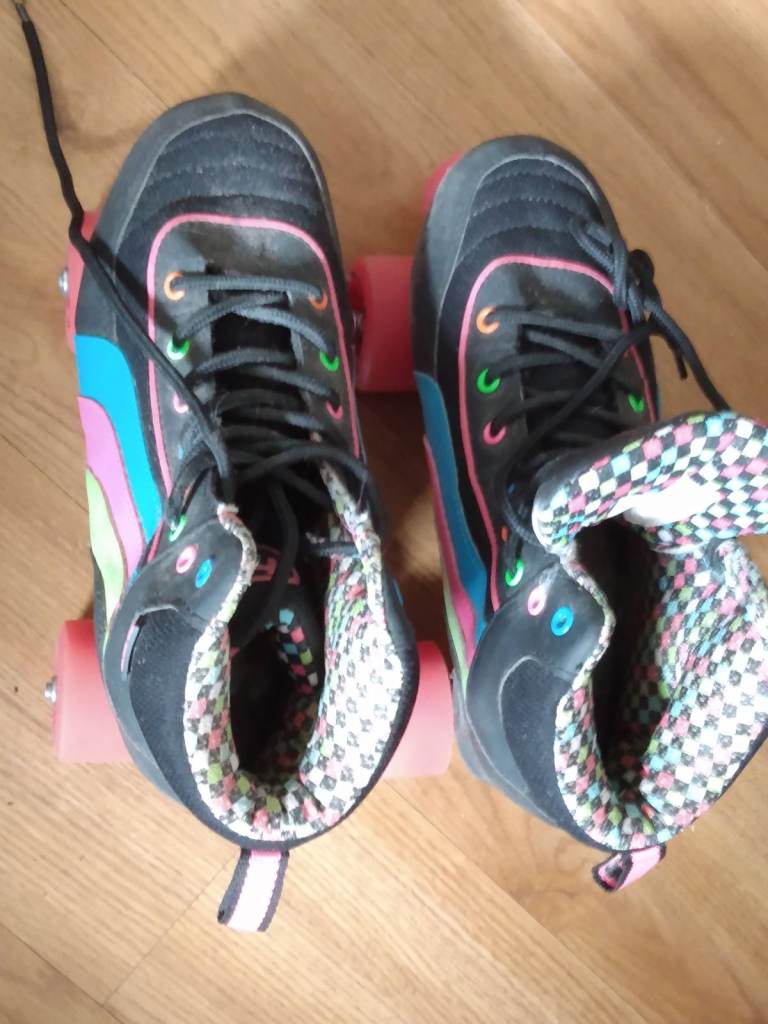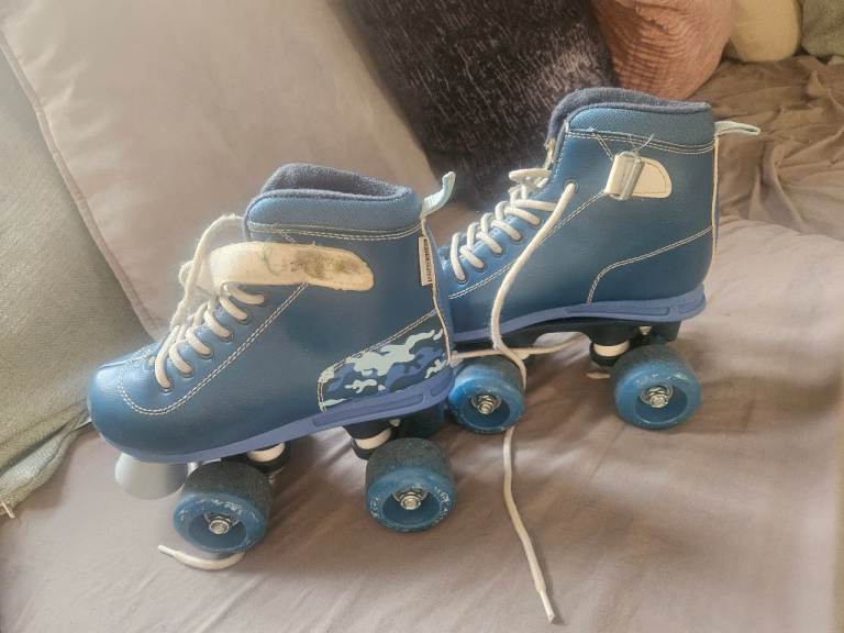 This is a pair of United Skates Vibe quad roller skates in a camouflage blue color. Size 13