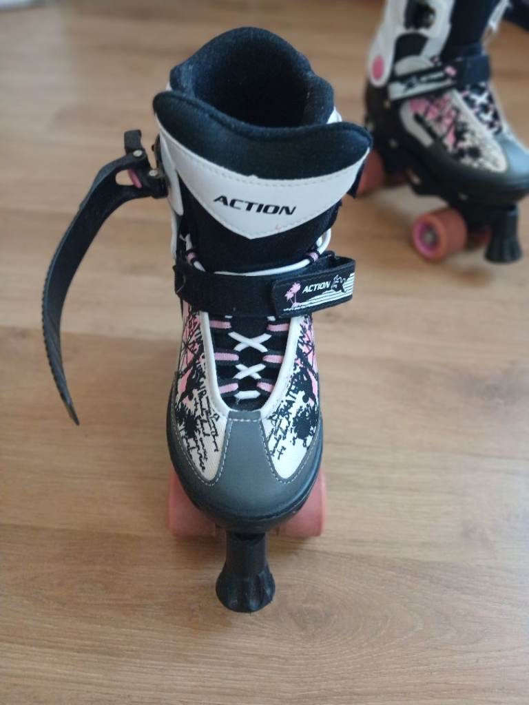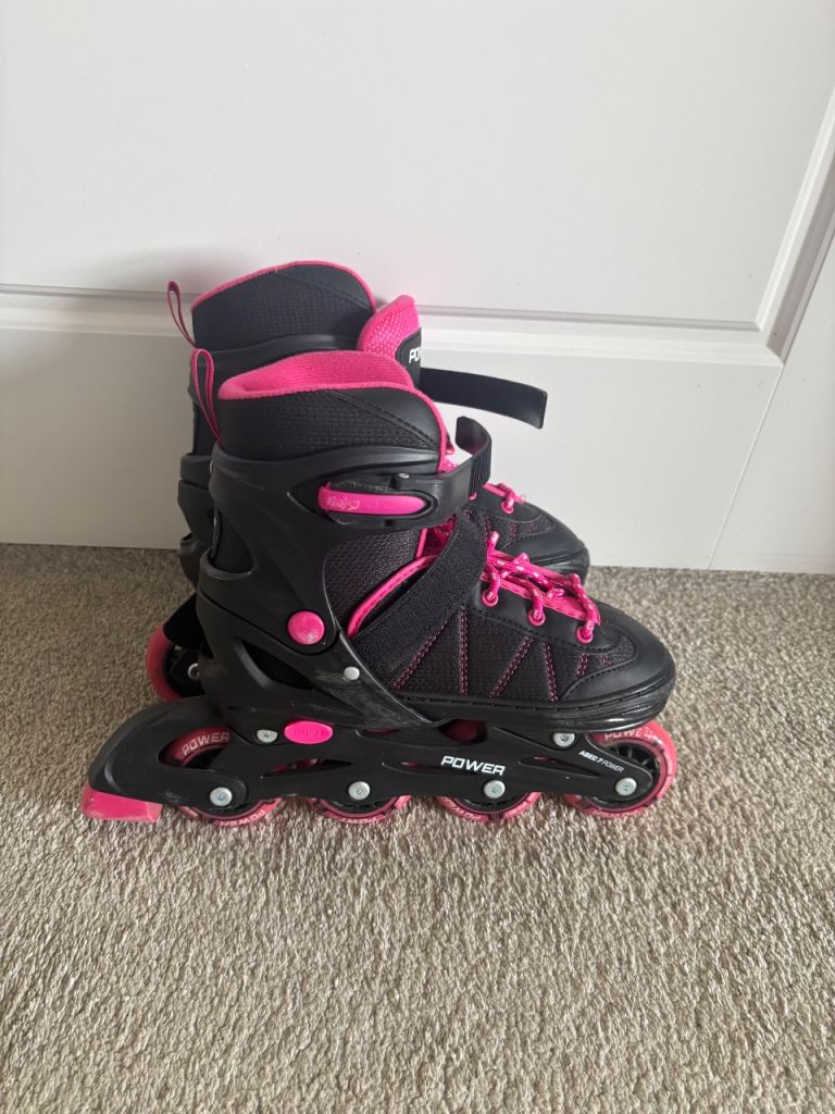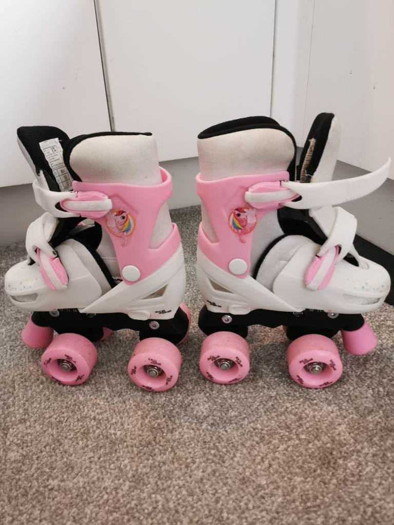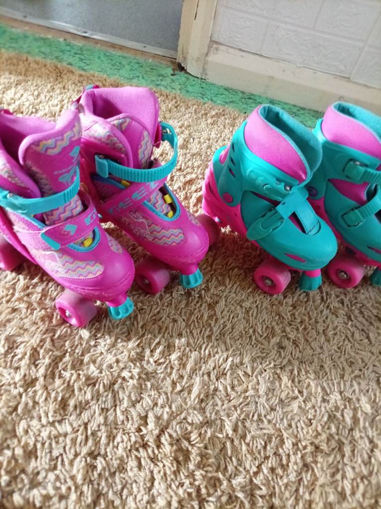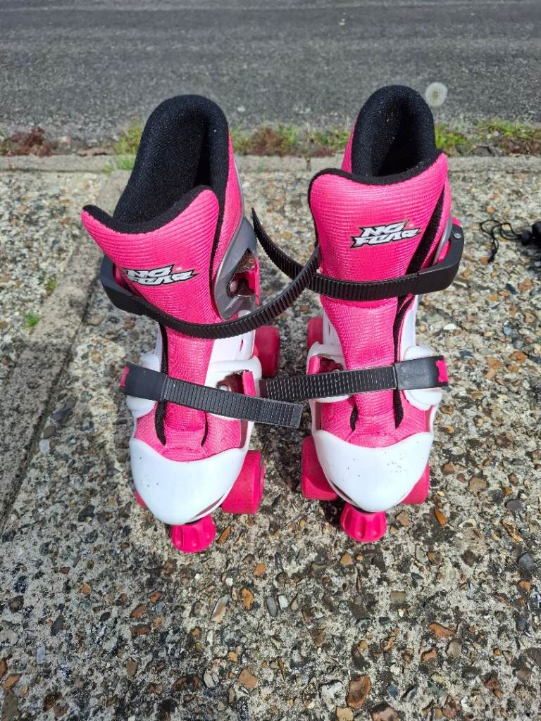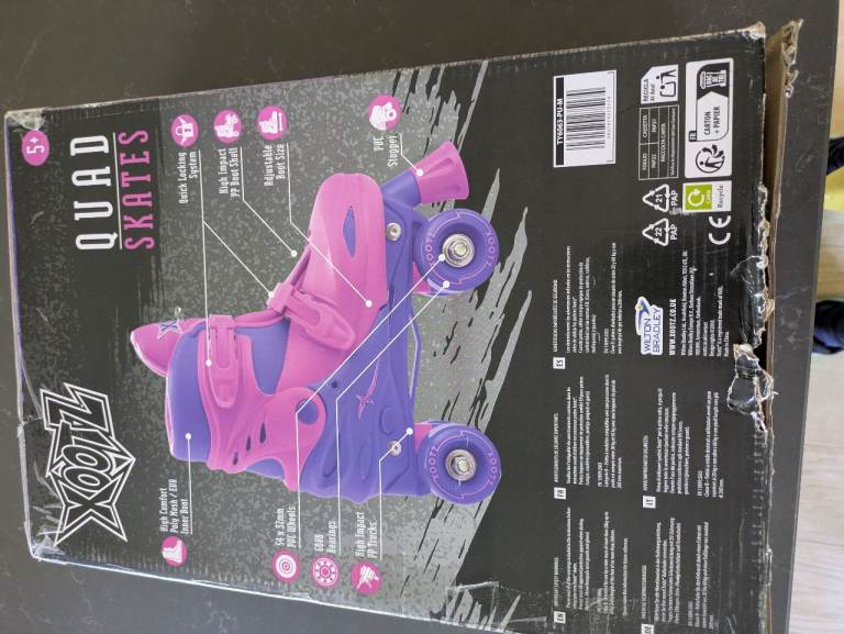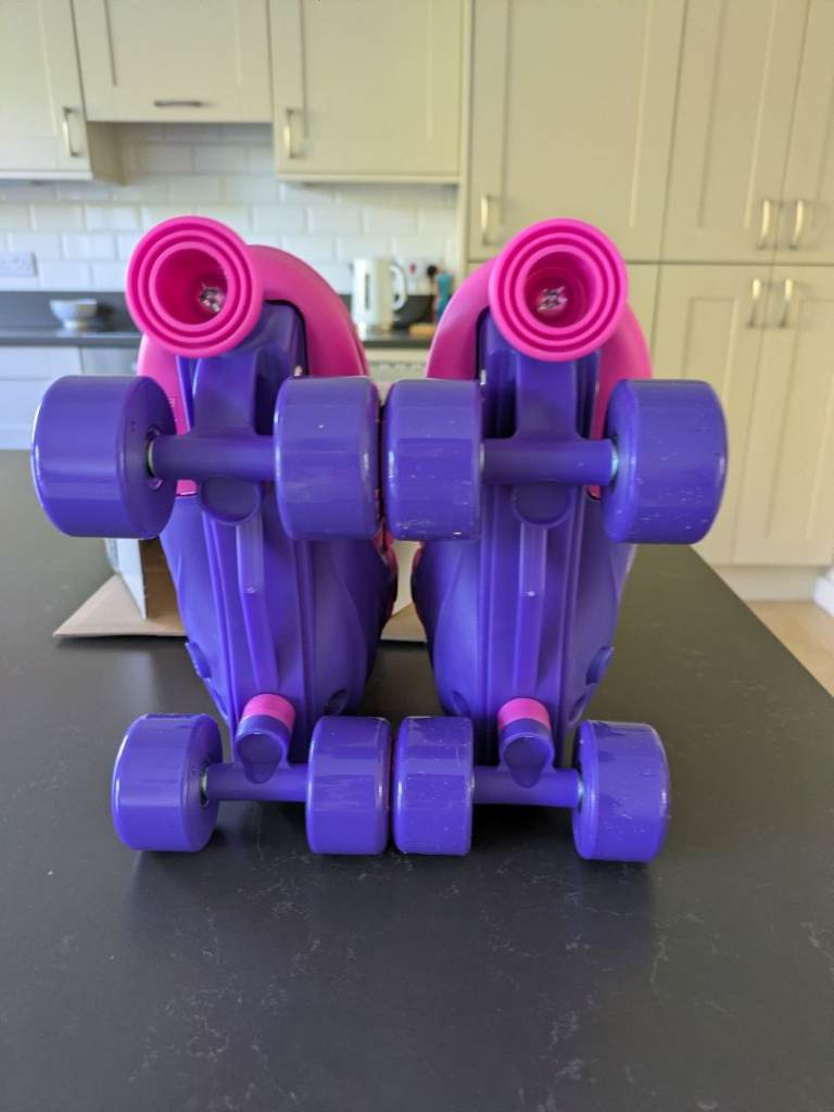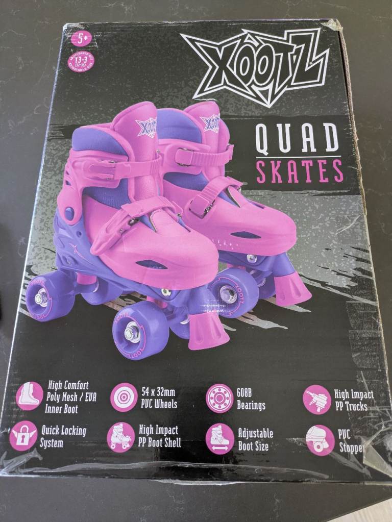 Xootz quad skates in a stylish pink and purple design for beginner young skaters. The skates have a cushioned boot with ankle support providing added comfort.
