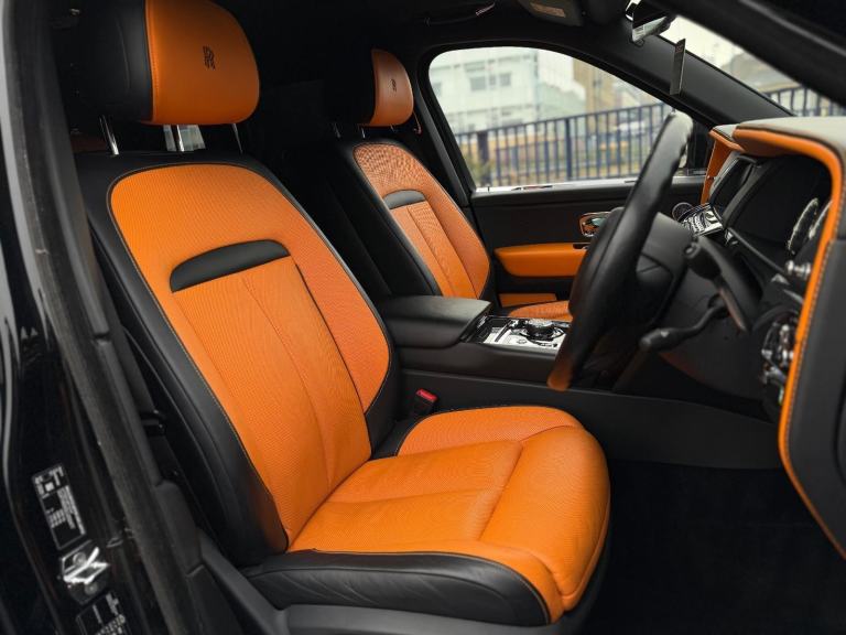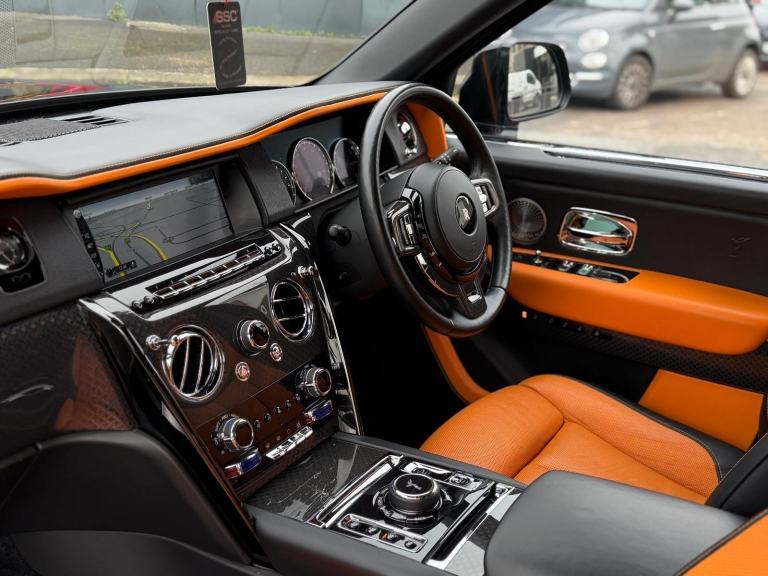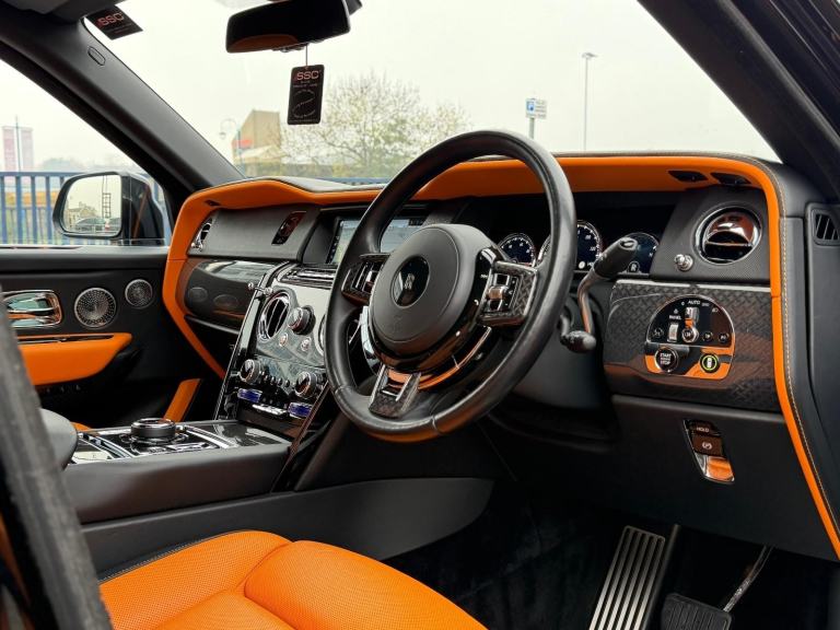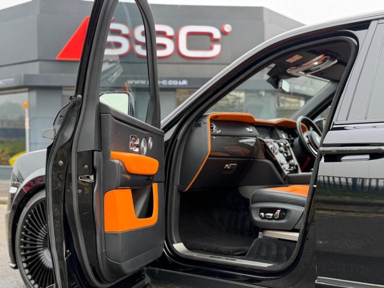 Stunning Cullinan Black Badge Finished in Diamond Black With Mandarin and Black Leather. Fantastic Spec Inc: Revere Widebody Aero Bodykit, Upgrades Revere WC9F Forged Alloys in Mayfair Black, Dechrome Pack, Starlight Headliner, Rear Entertainment Experience, TV Function, Power Folding Picnic Tables, Heated and Cooling Front Seats With Massage and Memory, Rolls Royce Bespoke Audio System, Ambient Air Packet, Power Operated Rear Window Curtains, Night Vision With Person Recognition, Driving Assistant, Adaptive Cruise Control With Stop and Go, RR Monogram to All Headrests, Event Box Prep, Spirit of Ecstasy Embossed on Door Trim Panels, Full Seat Piping, Coloured Stitching, Black Badge Technical Carbon Trims, Lambswool Foot Mats, Self Closing Doors, Head Up Display, Surround Camera System, Park Assist, Sun Protection Glass, Extended Leather Trim, Instrument Panel With Top Stitch, Signature Key in Mandarin, Smartphone Interface, Wireless Charging, High Beam Assist Comfort Access, Integrated Universal Remote Control, Tyre Pressure Display, Professional Navigation System. This Cullinan Comes With Full Service History.