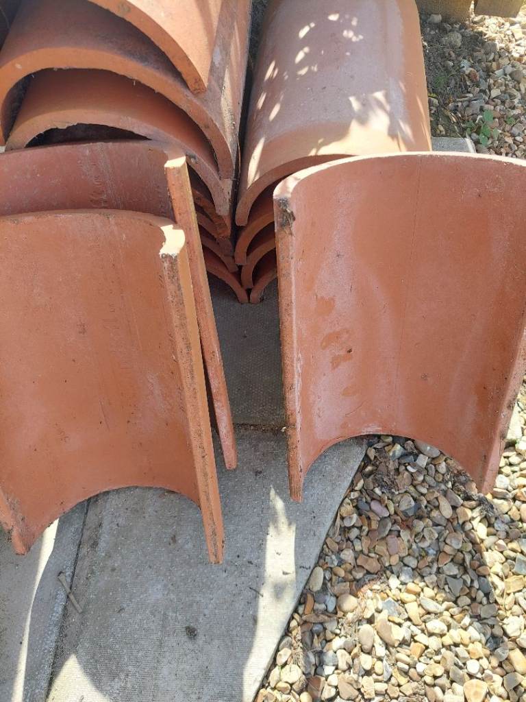 14 Sandtoft Clay Ridge Tiles, excellent condition, new, but stored in yard, therefore weather stained.