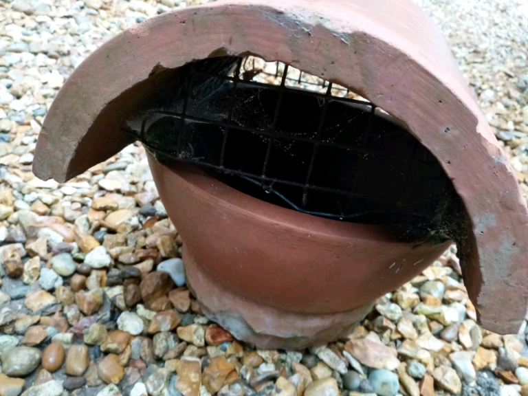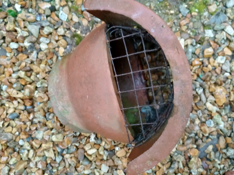 Vintage terracotta chimney cowl. With metal netting to prevent birds from entering the chimney. Approximate measurements