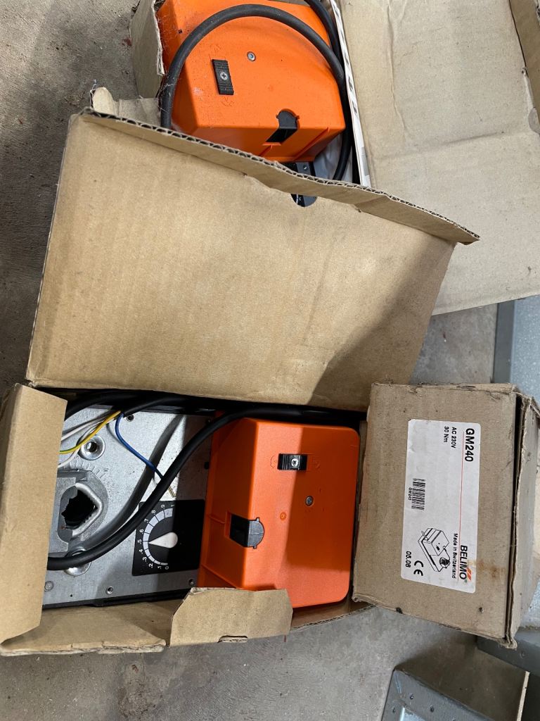 2 very high quality ventilation louvres and 3 Belimo GM240 actuator motors. 450mm x 450mm air flow size. All new old stock. The motors are £250 each new. So bargain at £250 the lot.