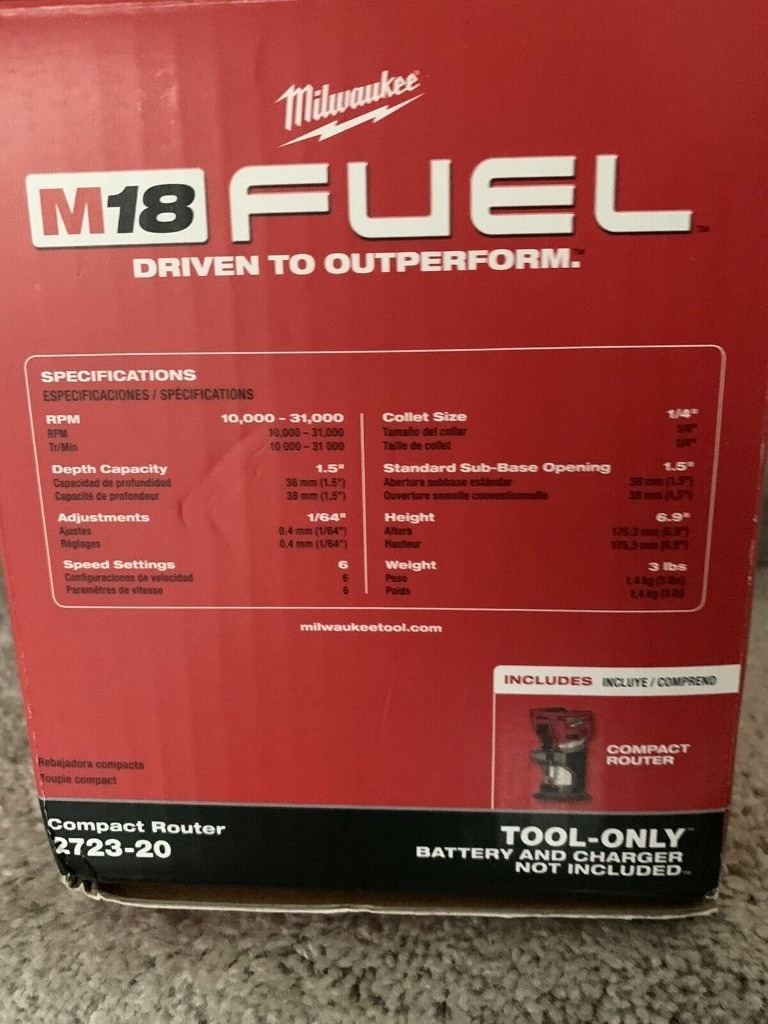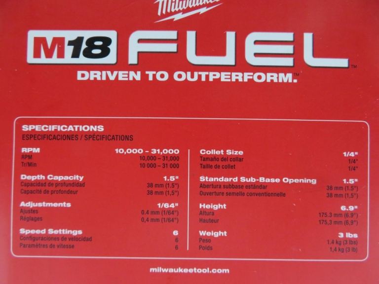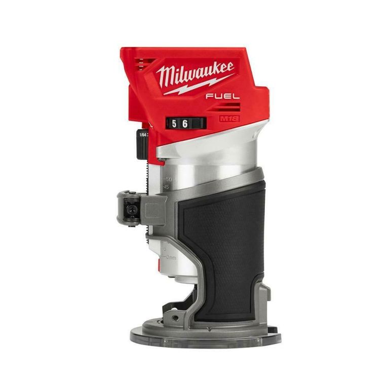 The MILWAUKEE® M18 FUEL™ Compact Router combines power, speed and accurate depth adjustments to deliver clean accurate cuts in a variety of materials and applications. The compact router leverages the POWERSTATE™ Brushless Motor and REDLINK PLUS™ electronics. This delivers the power of corded 1.25 horsepower trim routers and best-in-class 31,000 RPM delivering users with power and speed for clean, quality cuts in hard materials. With an M18™ REDLITHIUM™ XC5.0 battery, the cordless compact router cuts up to 250ft of 3/8" roundovers in red-oak, providing users with all-day run time with fewer trips to the charger. The handheld router is equipped with a micro-adjust dial and macro-adjust button, giving users fast and accurate depth adjustments for highly accurate work. A variable-speed dial with speed from 10,000 to 31,000 RPM gives users control in all applications. The trim router also features a sturdy 4" sub-base plate giving users stability, and dual-LED lights illuminate their work surface. The M18 FUEL™ Compact Router is compatible with a plunge base and an offset base (sold separately).