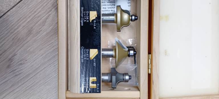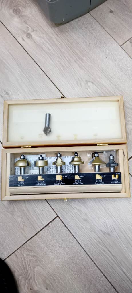 C/w 1/2 inch shank tungsten tipped router bit set in box.