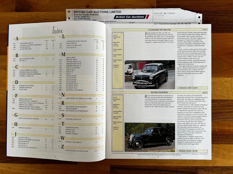 Our vendor purchased the Rover at the British Car Auctions' Blackbushe auction on Monday 7th October 2002 (a copy of the auction catalogue is within the car's history). He was very keen to purchase a car with family history.