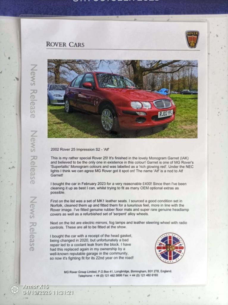 Only done 68500 miles, this will go up as I am still using her. Head gasket replaced in 2024.Full leather interior. I have just installed a new stereo with Bluetooth in and new front door speakers. Everything works as it should apart from the Aircon which has never worked since I've owned it. I did an oil and filter change a couple of months ago. Rover headlight protectors on her which are quite rare. Rover alloy wheels.The front wheel arch is starting to get a few rust bubbles on it, Have a look at the pictures. The lacquer is starting to peak in a couple of places. This car is mechanically sound.Cheap on insurance .I have done a few long trips in her down to Cornwall and back. Never missed a beat. Only selling as I've got a campervan now.