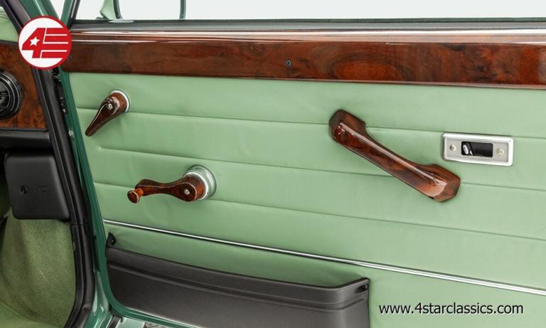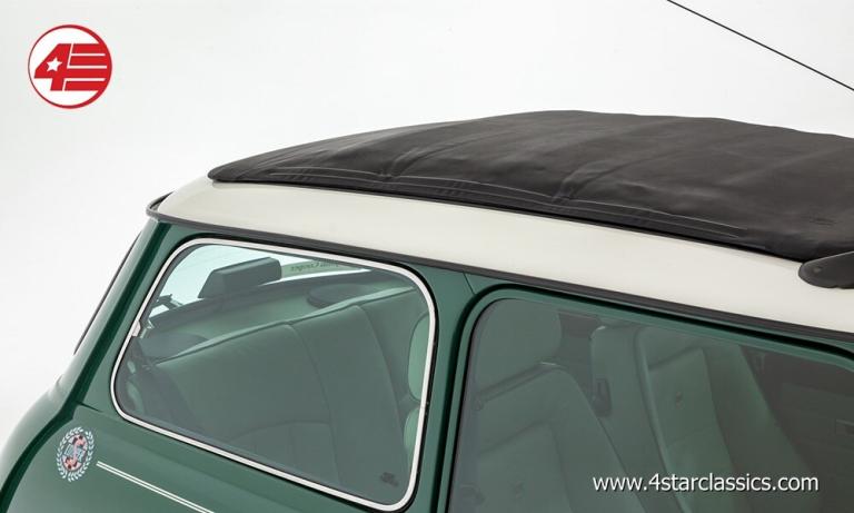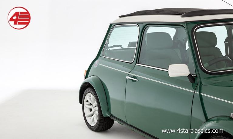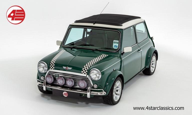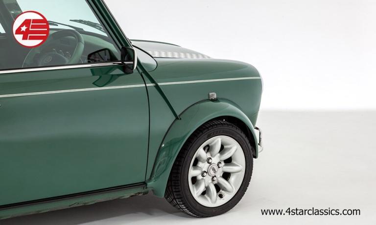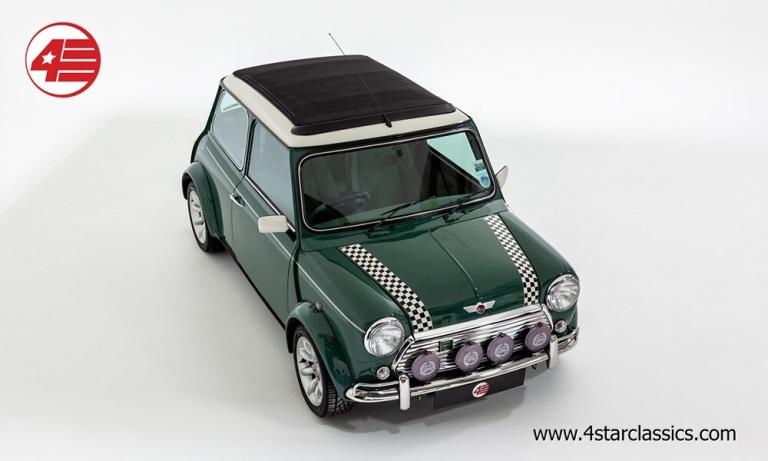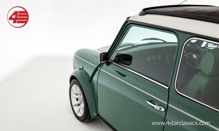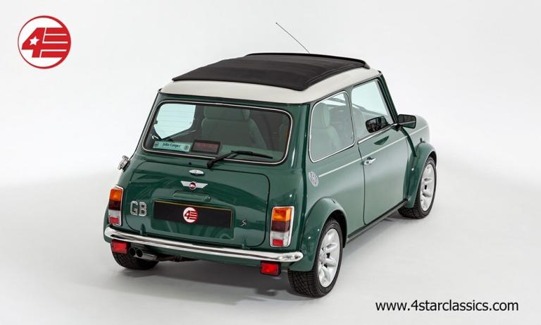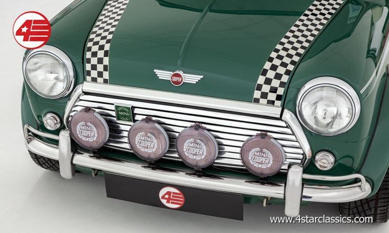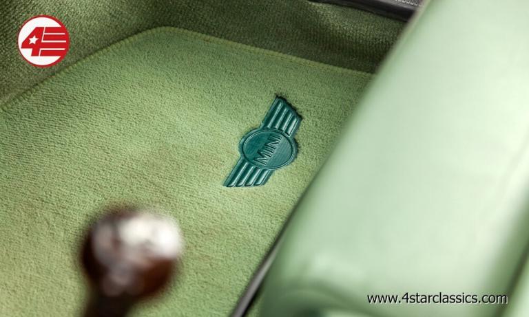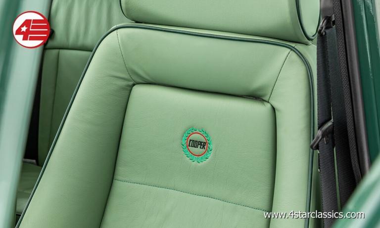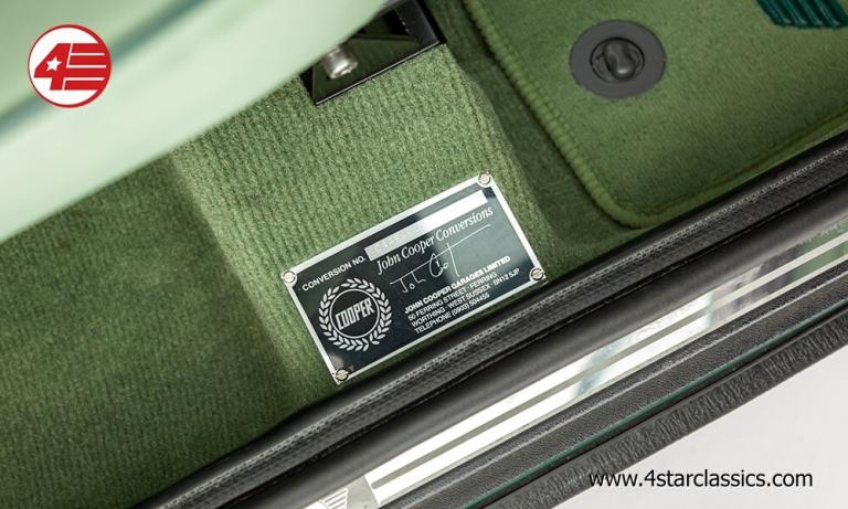 Almond Green classic paintwork, Porcelain Green leather Recaro seats, John Cooper 90bhp Works engine conversion (MCC1275 SW), 4-speed manual transmission, Sports Pack including 13-inch Sports alloy wheels and body-coloured extended wheel arches, Electric sunroof, Wood door and rear quarter cappings, White roof and door mirrors, Chequered bonnet stripes, Front bumper overriders and corner bars, Rear window wiper, Twin exhaust pipe, Cooper S decals, Cooper red badge, Individually numbered 'Si' plaque, Four additional driving lamps with covers, Twin rear fog lights, High-mounted stop lamps, Polished door sill covers, Mini overmats in green, Immobiliser, Spare key, Original sales literature.