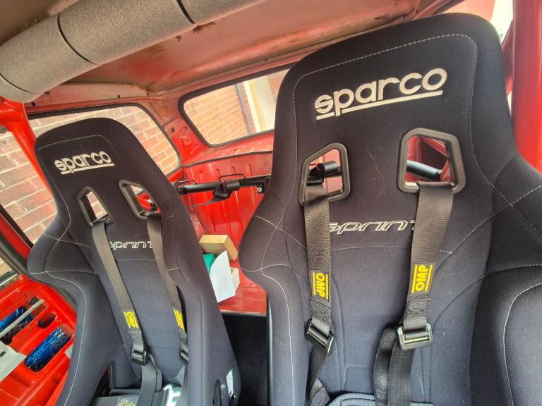 Sparco spring bucket seats with alloy side mounts.