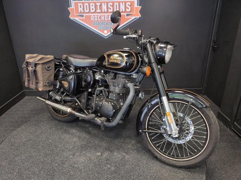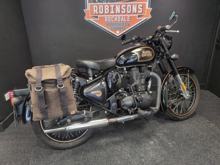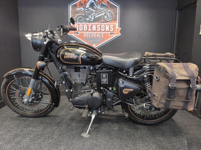 2021 21 Royal Enfield Classic 500 Tribute Black with 6573 miles. The Royal Enfield Classic 500 Tribute Black is a limited-edition, end-of-production model celebrating the Classic 500's legacy. It features a unique dual-tone black livery, pinstripes, and a commemorative 'End of Build' serial-numbered plaque. This model, with its fuel-injected 500cc engine, aims to be a collector's item, embodying the timeless aesthetics of the Classic 500... This example has been fitted with a after market exhaust. Two keys and the owners book are with the bike...