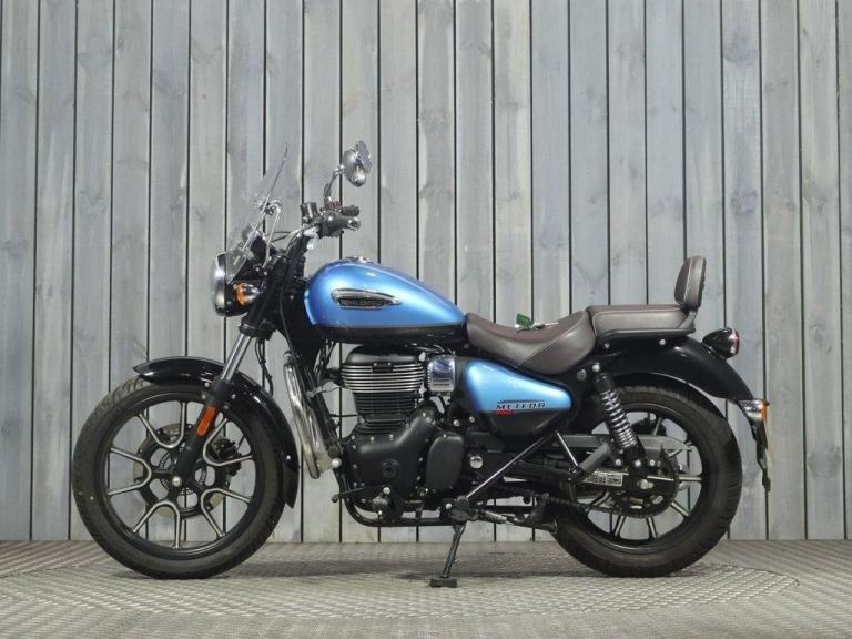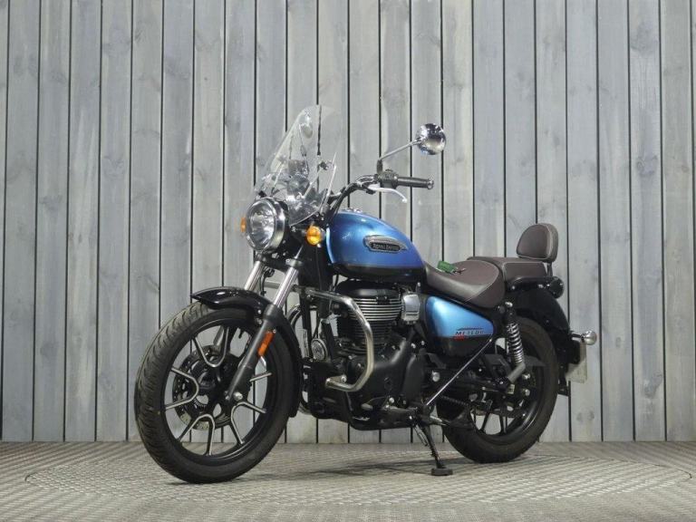 This 2023 BLUE ROYAL ENFIELD METEOR 350 motorbike has done 838 miles and is in great condition. It's available for collection from our MACCLESFIELD showroom or can be delivered anywhere on the UK Mainland. This bike has 1 previous owner, comes with 2 Keys, a FULL SERVICE HISTORY, and last serviced at 396 miles.