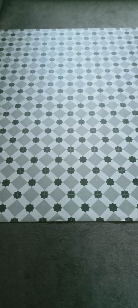 It is a Geometric pattern tile design in white, grey & black. I recently did my ensuite with this vinyl and it looks lovely - see all my pictures taken. This was left over from the job.