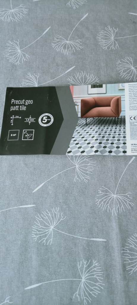 I am selling new B&Q Pre-cut Vinyl, which is suitable for a small bathroom/ensuite, kitchen or hall. The size is 200cm x 185cm.