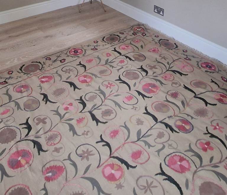 Brown base with beautiful pink suzani type flowers.