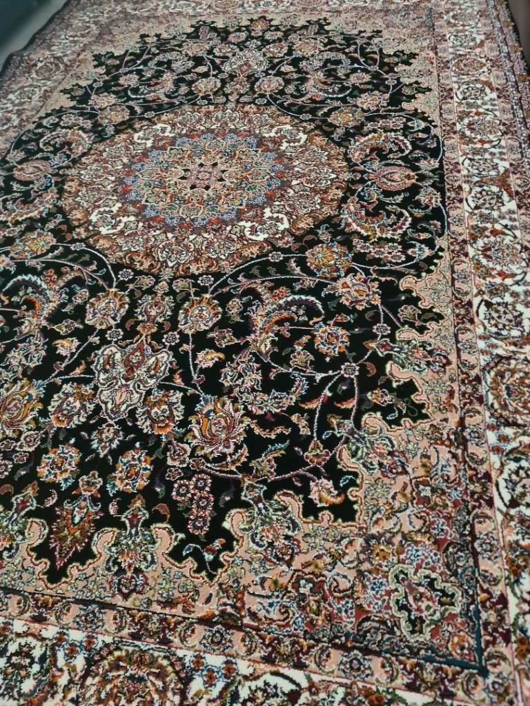 thick with tassle edge, black background, black edging , colours are mixture of taupe bronze some green hard to give clear picture of exact colours , photos are to best of my ability I would describe as black multi ,