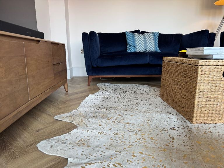 We are offering a luxurious gold-metallic cowhide rug, size approx 220 cm (length) × 180 cm (width), in excellent used condition.