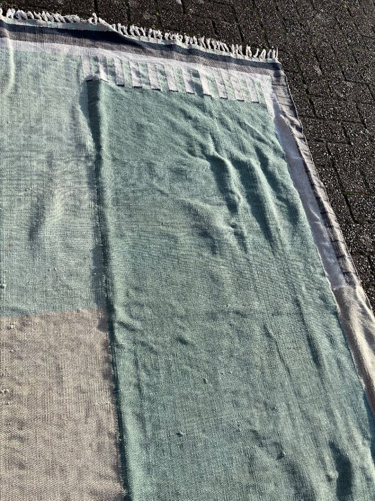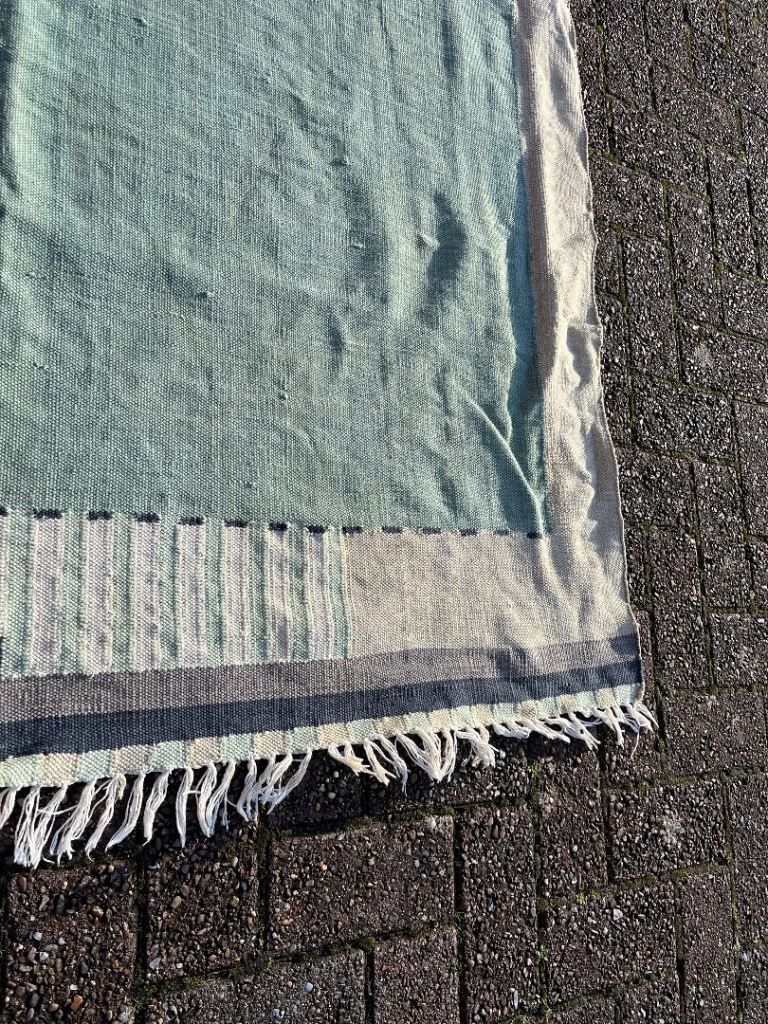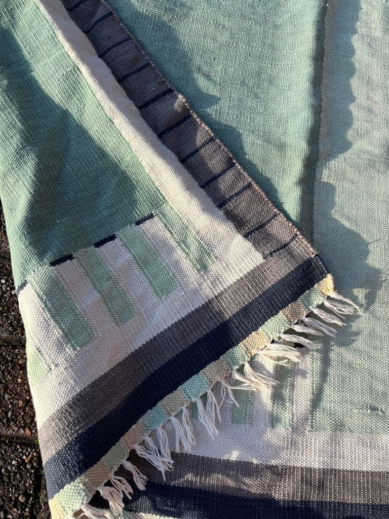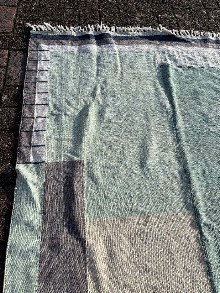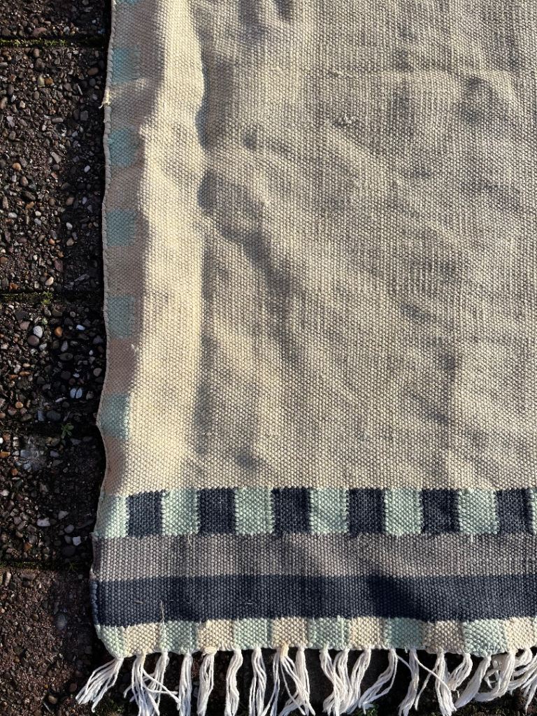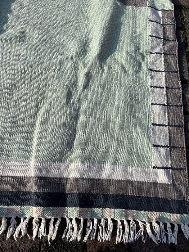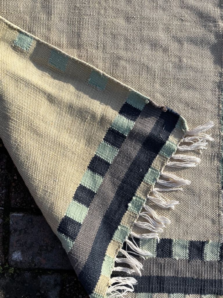 Great condition Habitat Kilim rug with block geometric pattern of pale green and beige in North African style. Tasselled ends. Measures 179 x 125 cms