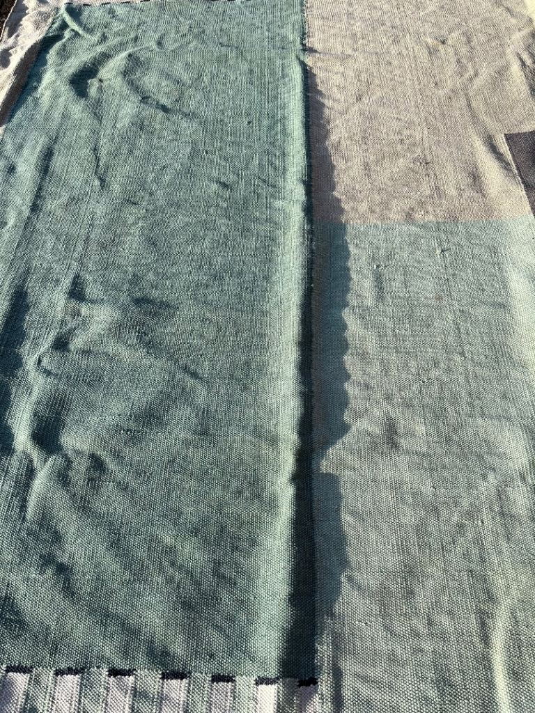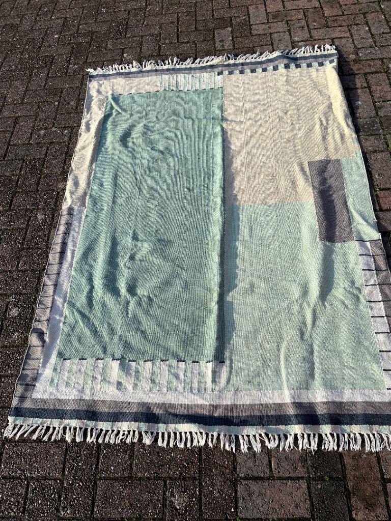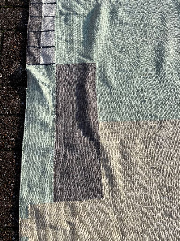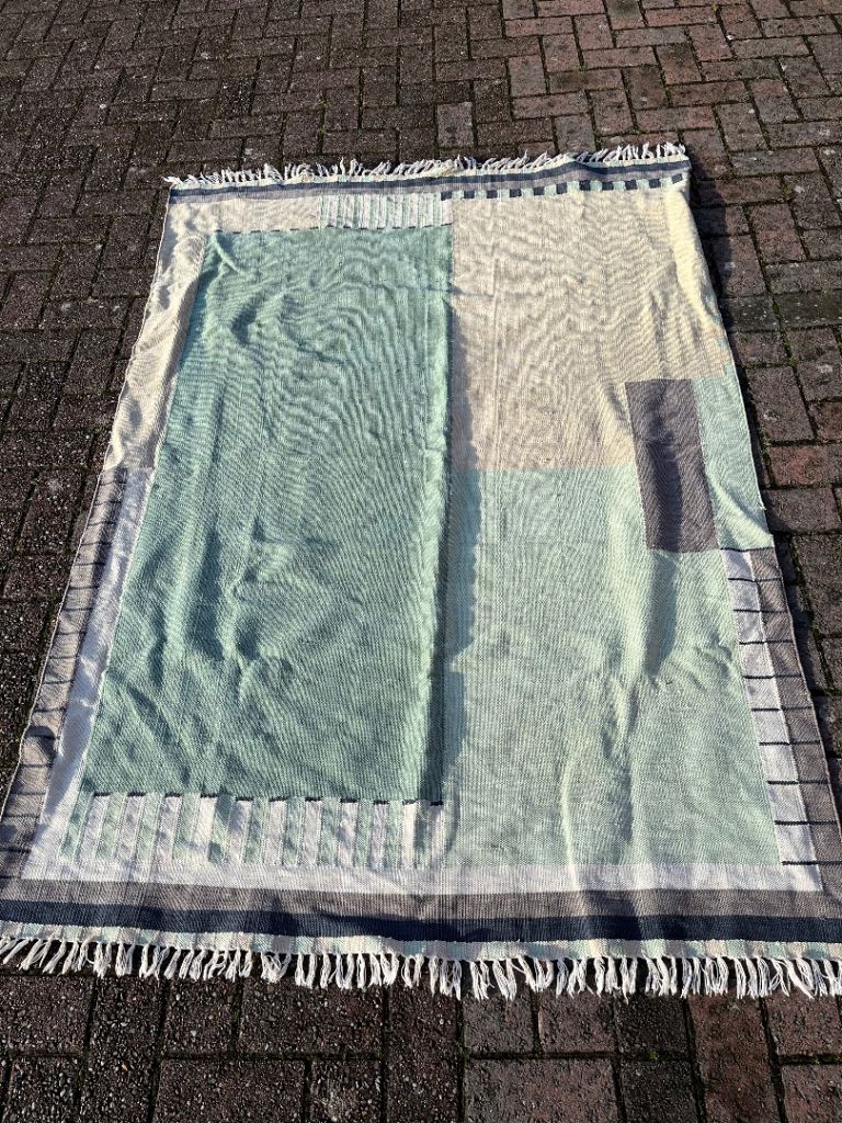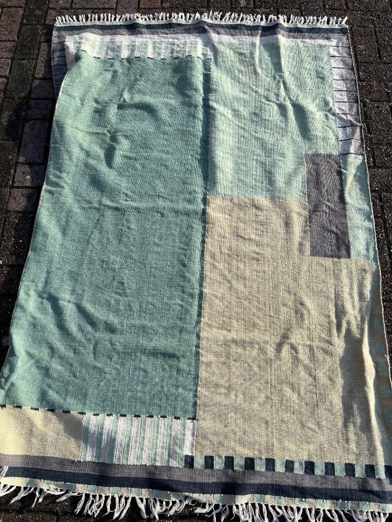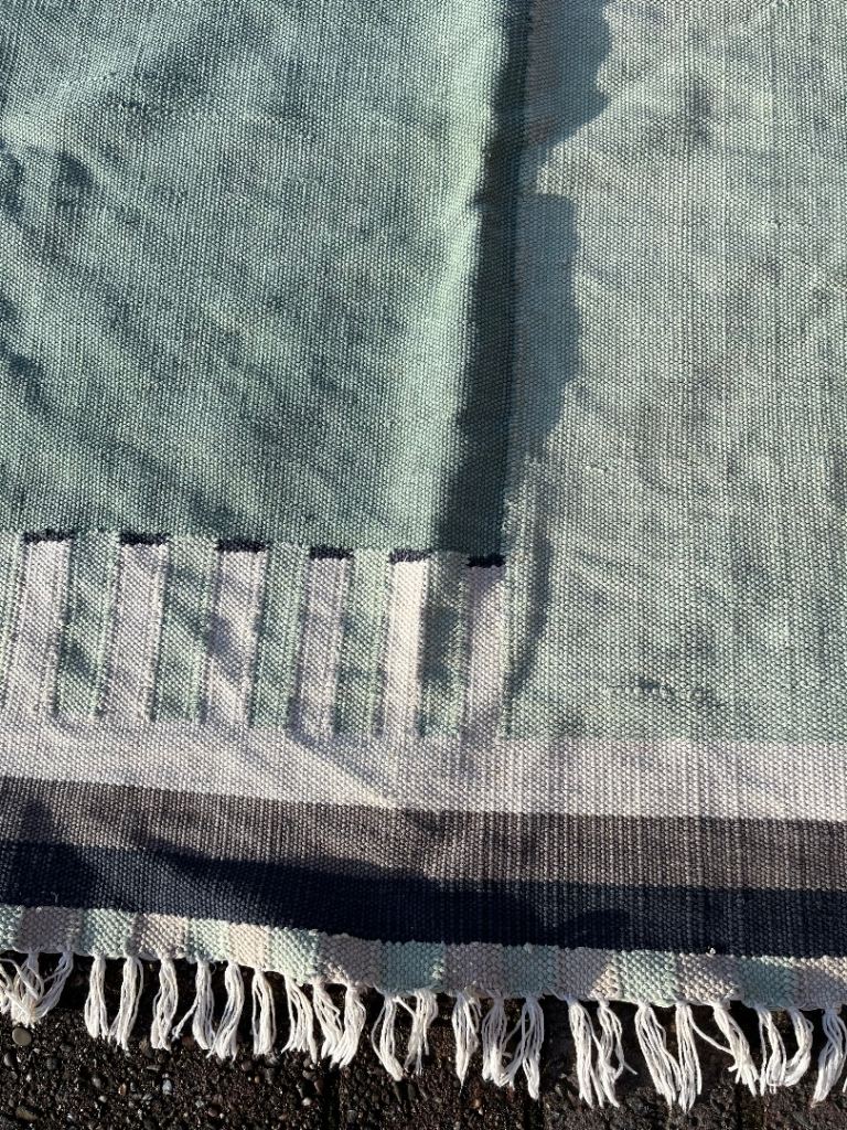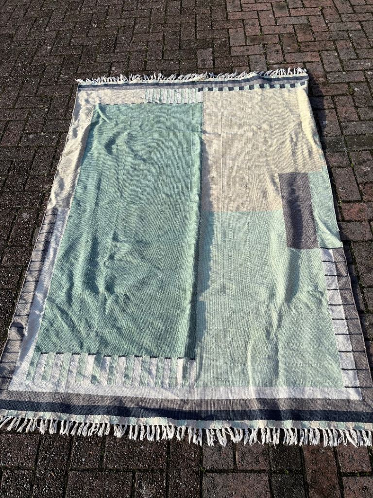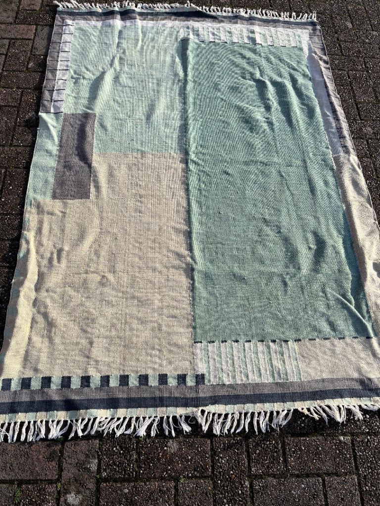 Great condition Habitat Kilim rug with block geometric pattern of pale green and beige in North African style. Tasselled ends. Measures 179 x 125 cms