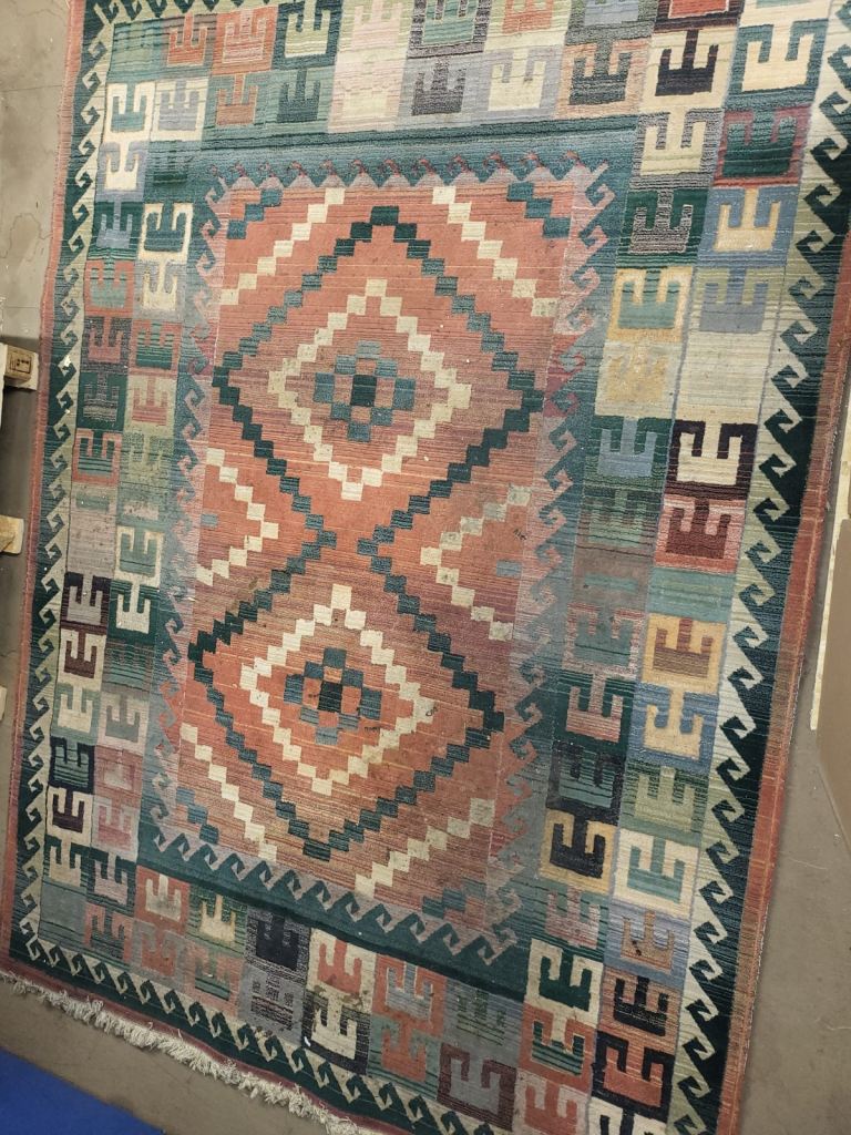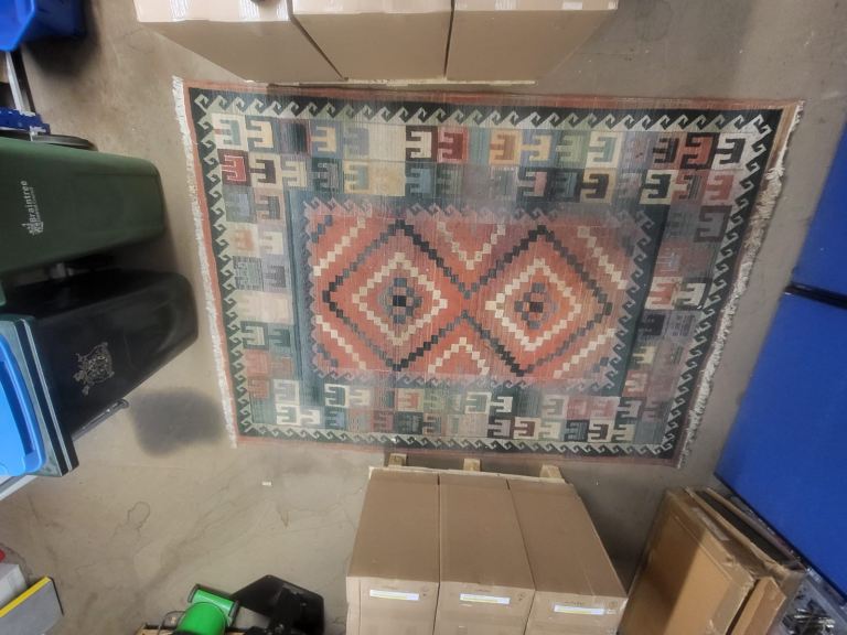 High quality durable hessian backed rug, very sturdy and well made with great design and great colours. Ideal for a large space to enjoy the beauty and ambiance. Original price from new £180.00. Would benefit from a deep clean hence the reflection of the price. Size 290cmx200cm