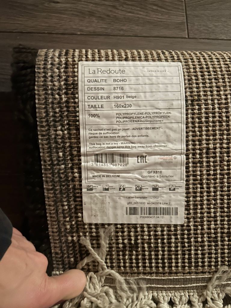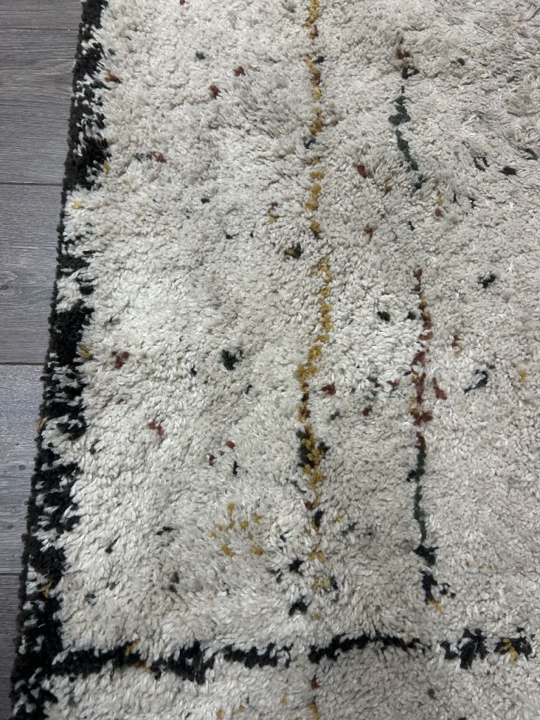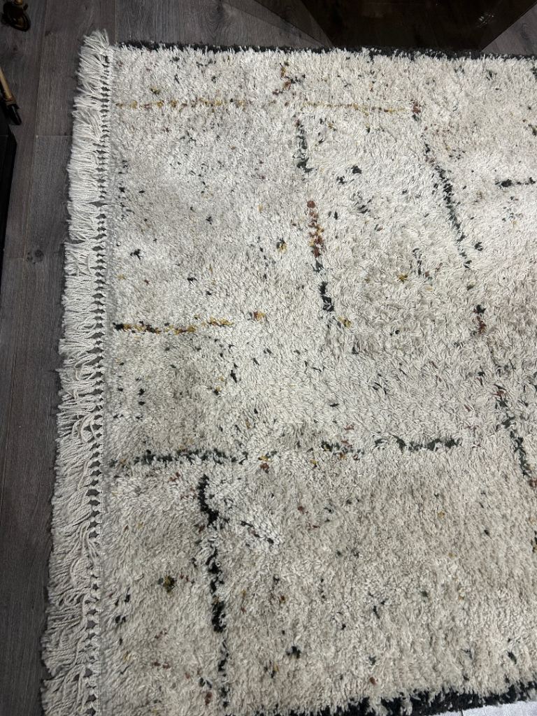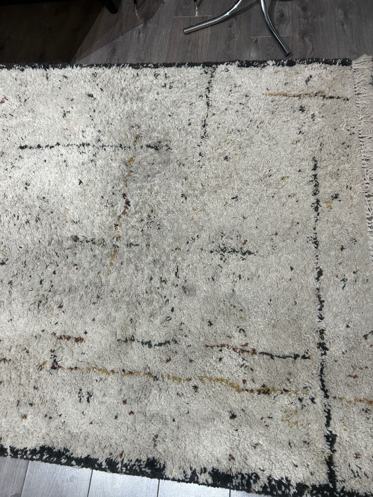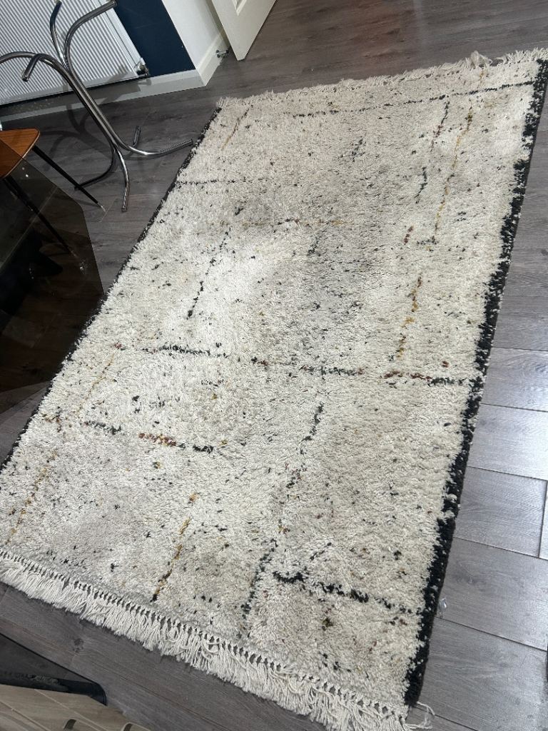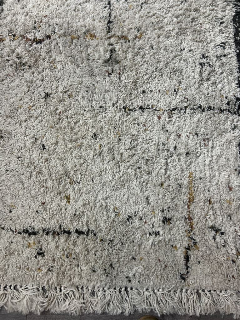 La Redoute boho tufted rug in cream with black, mustard & brown design and tassels at ends