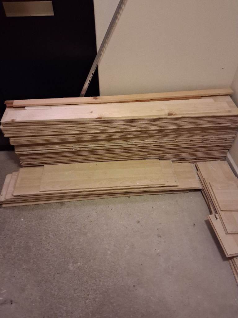 Light oak effect laminate flooring for sale. Approx. 17.5 sq. mts, including the same area of 2mm underlay. A couple of boards have chips and the boards will need a mop over to easily remove specks of white emulsion.