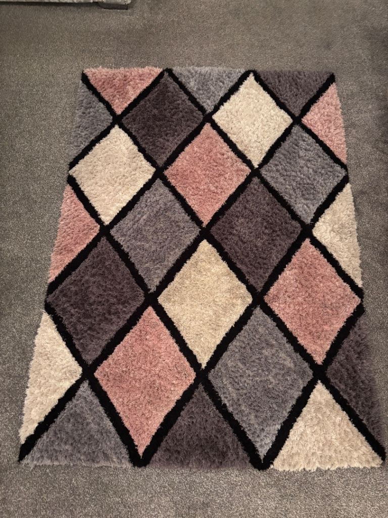 Large diamond rug. Grey pink and white still in good condition. Just been cleaned with carpet cleaner