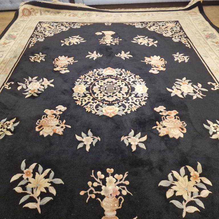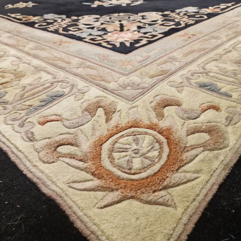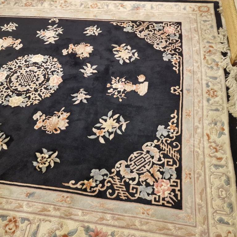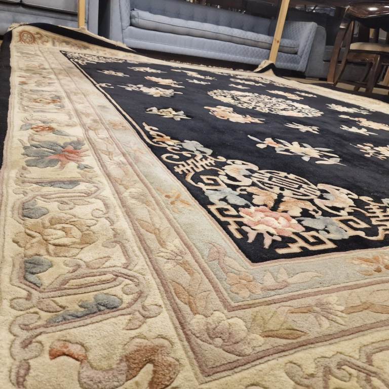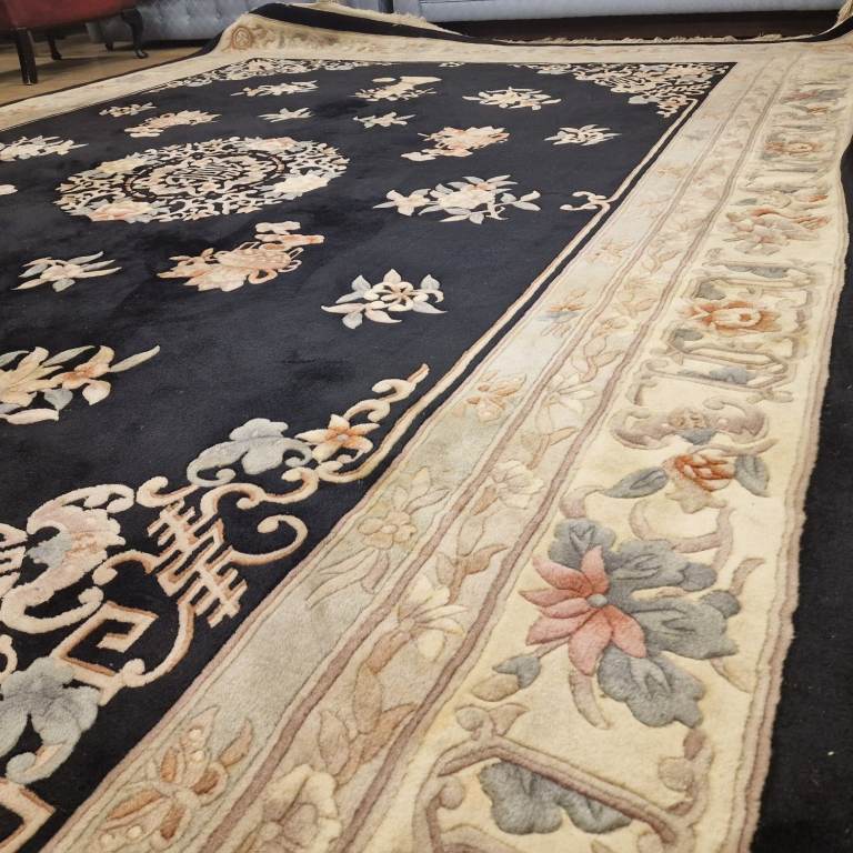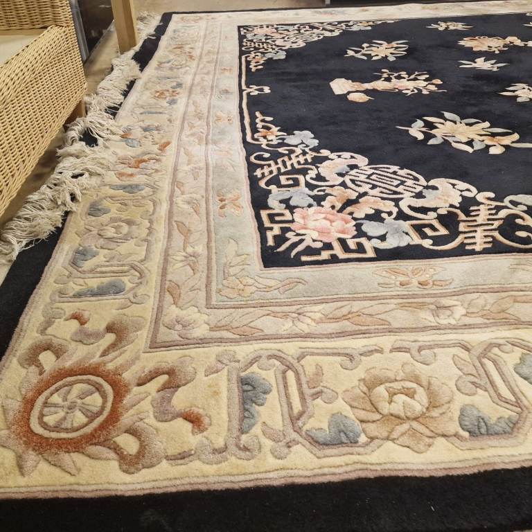 Large vintage Chinese wool rug with a deep navy centre and beautiful floral motifs, surrounded by a wide carved border in soft creams and pastel tones. The wool pile feels thick and luxurious and it makes a real statement in a living room or reception space. Overall in used vintage condition, though it would benefit from a clean to really freshen up the colours, as shown in the photos.
