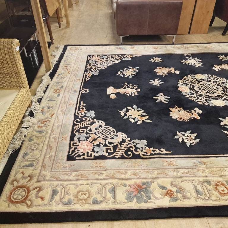Large Vintage Chinese Wool Rug – Navy & Floral Border, 370 x 276 cm