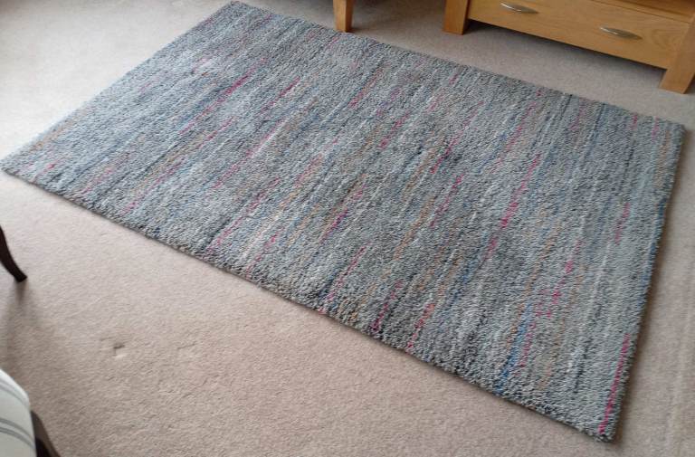 Attractive thick soft pile mixed colour rug. Mainly grey with blue and red stripes. Very good condition.