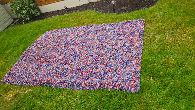 Brought new a few years ago and never used. Kept rolled up indoors in a room in the house. Also have a new anti slip mat to go with it. Cost nearly £200 new. Can be used indoors and outdoors. Its primarily black with a white pattern, bit darker than the images shown.