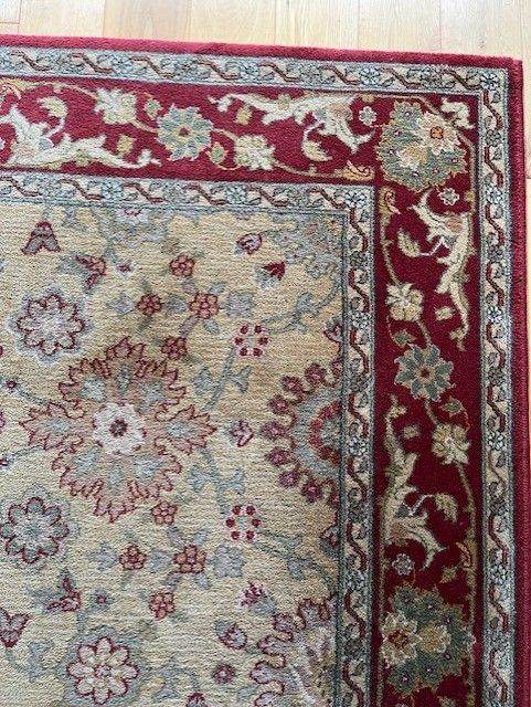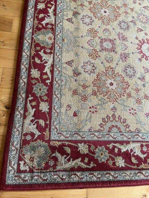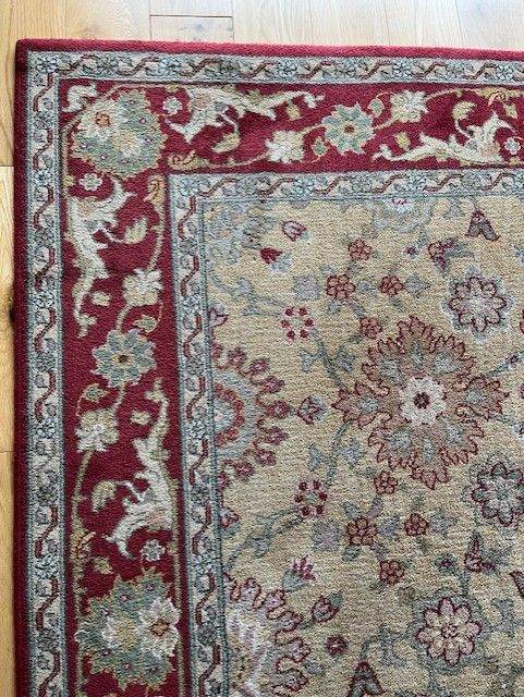 Pure new wool rug, quality brand and in very good condition. Size is 170cms X 240cms. Multi coloured and will match in with many colour schemes.