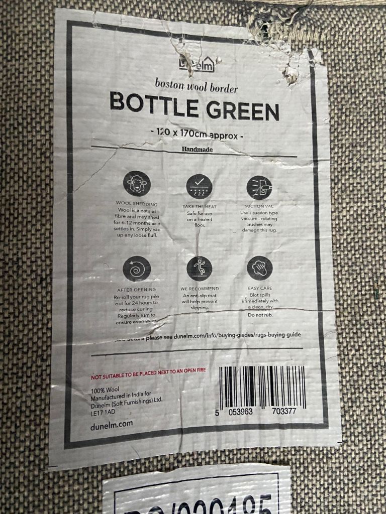 Bought from Dunelm 2 years ago, still in great condition. This is a Boston Wool Border Rug, Dunelm are no longer selling this rug in bottled green. Other rugs of this kind are currently retailing at £69. Only selling due to a change in decor. From a smoke free home. No stains/marks/tears. Have not cleaned it as it is made of wool but there are no odours. Dimensions are 120cm x 170cm. Happy for people to view it in person before committing to buy. Collection Sacriston.