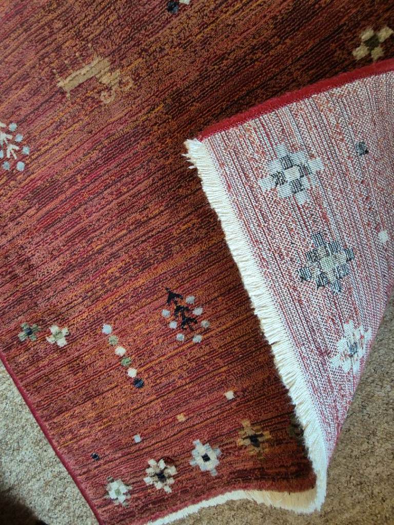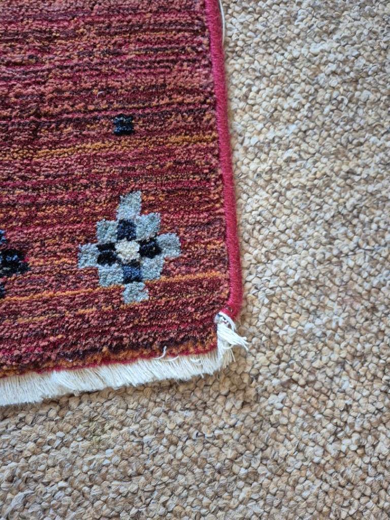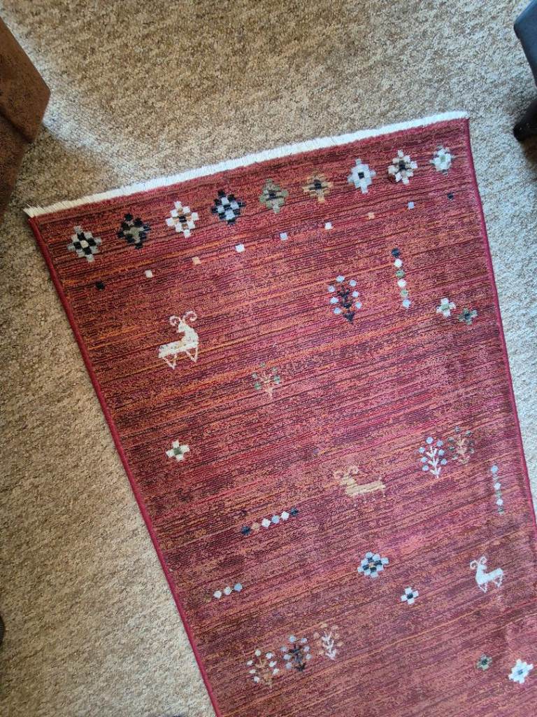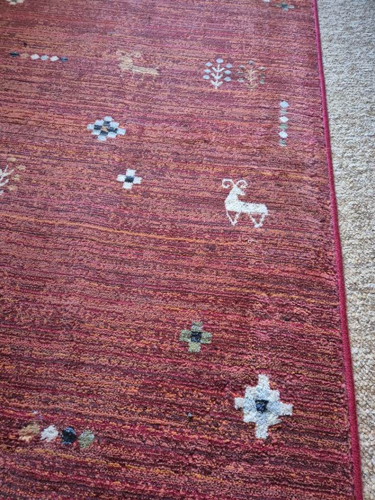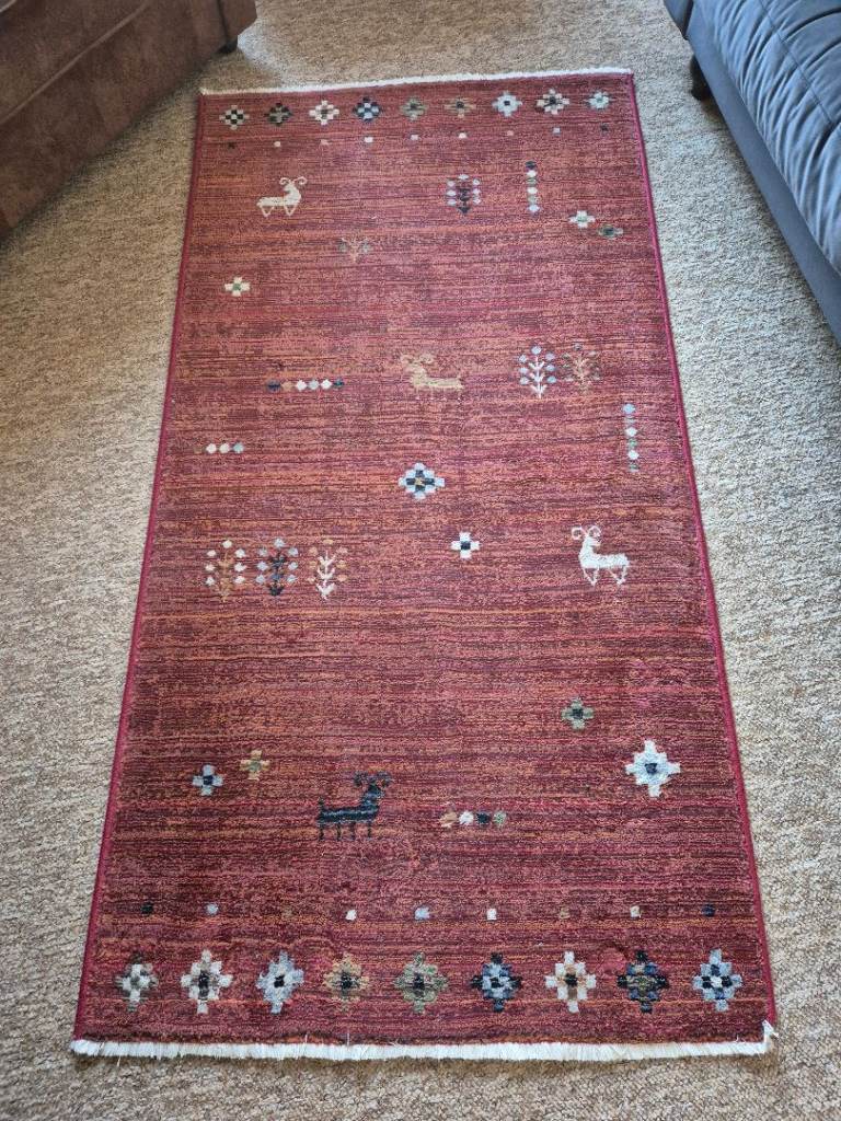 Small long rug. Antique look faded red with Scandinavian pattern. Fair condition, one corner just slightly stubbed by furniture but will flatten. Have no tape measure at the moment but runs the length of my teo seater standard sofa. Pick up only.