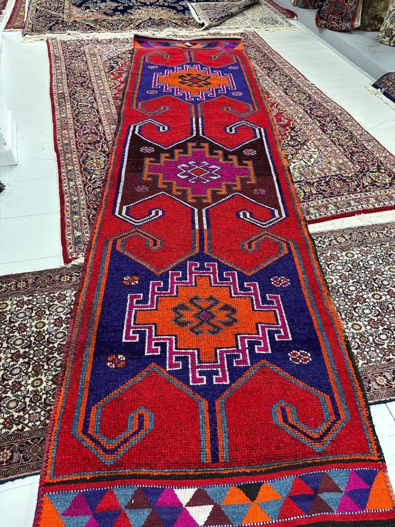 We are delighted to offer this rather handsome Kilim weave floor rug runner. Middle Eastern flat weave rug made of natural fibers in a traditional Kilim geometric design. A loom weaved rug in a delightful faded down but brightly coloured shades of brown, reds, blues & greens . A superb quality heavy weight rug in an easy to live with age related condition.