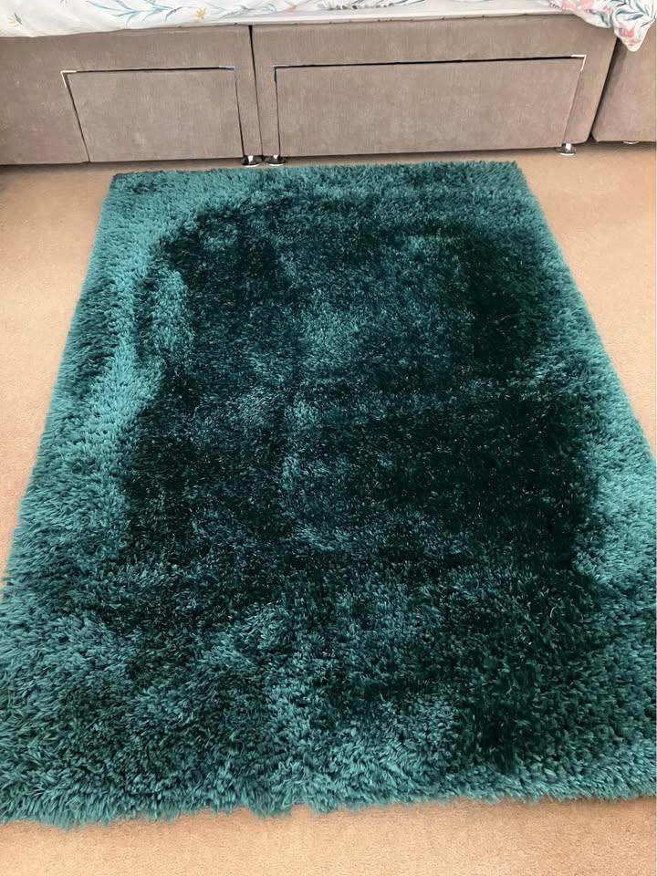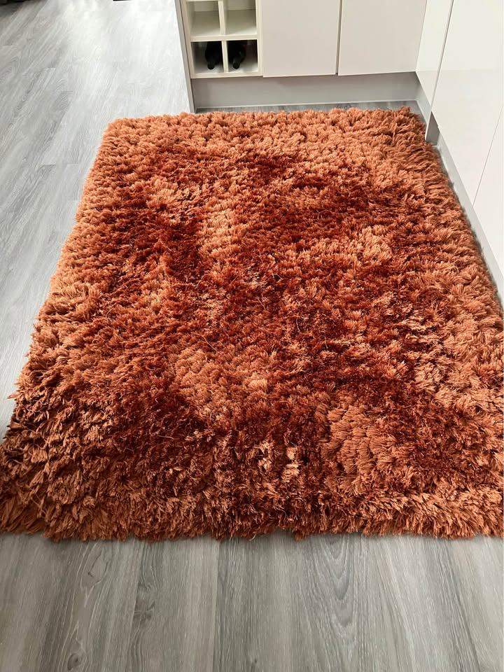 A rust-red shag rug featuring a shag weave and a thick, plush pile that is soft to the touch.