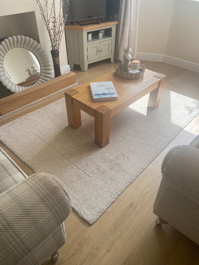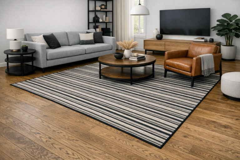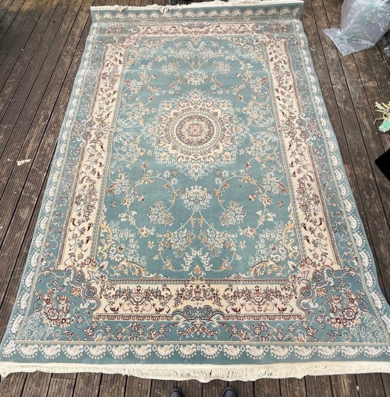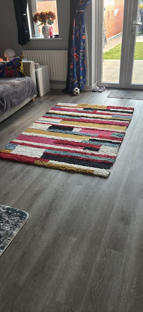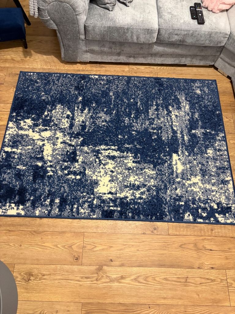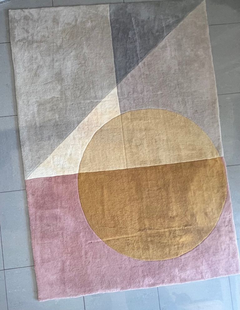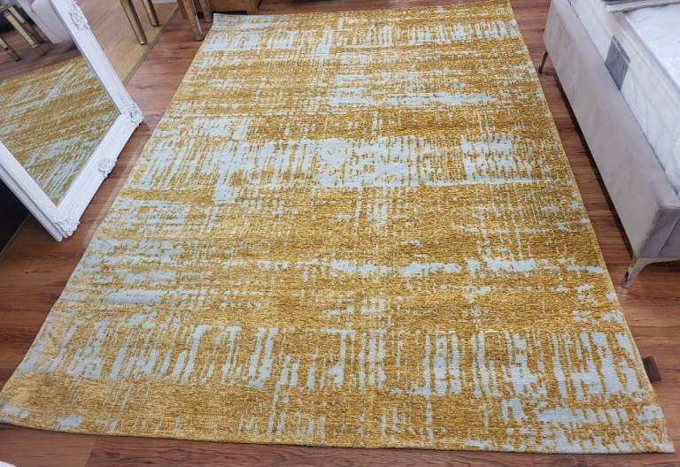 A beau Gold Rug, featuring a textured abstract design in gold and blue tones.