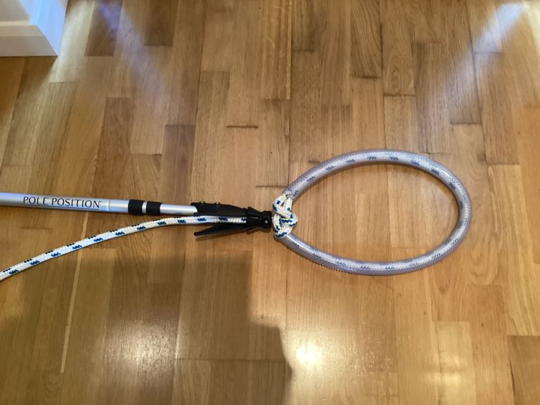 When coming alongside this extendable pole allows the noose of a mooring rope to be easily and accurately placed over a pontoon cleat. Once positioned a tug on the rope releases the noose.