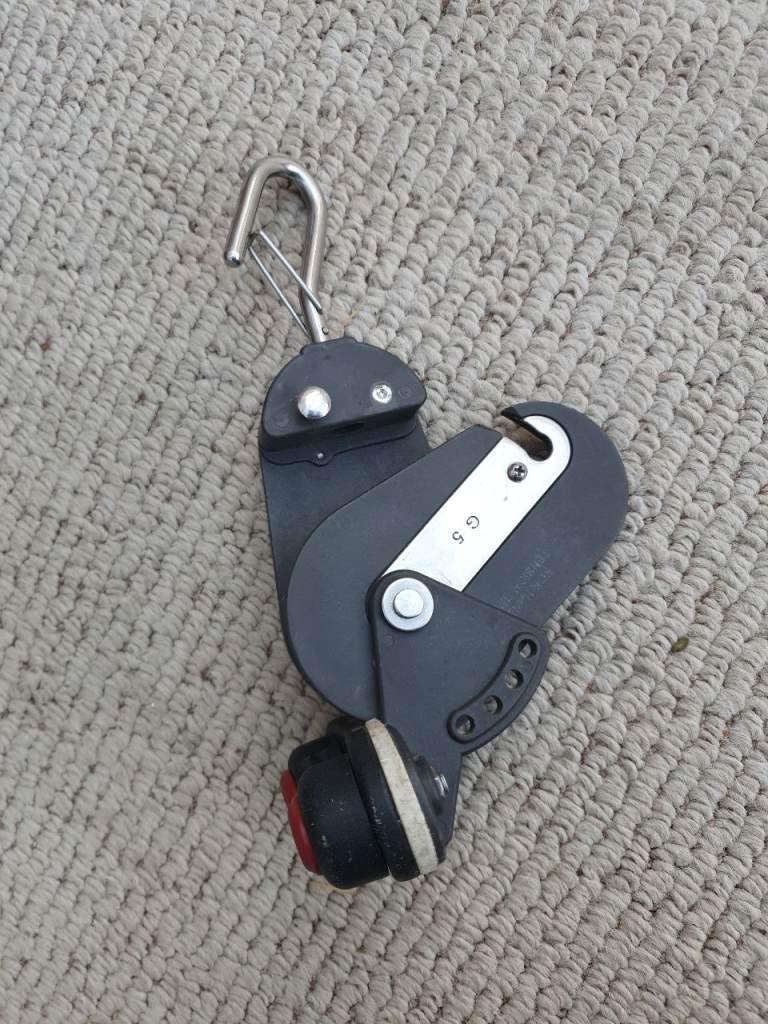 Snatch block. Swivel clip on fitting. 60mm sheave. Adjustable jaws. Don't know the make but model is PD6/G6A. Used but in very good condition.