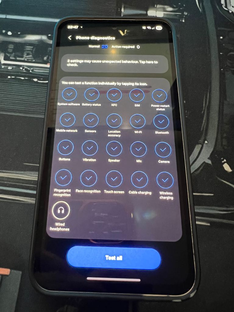 All tests passed (Samsung diagnostics) (Wired headphones diagnostic not complete because don't have wired headphones!! :D )